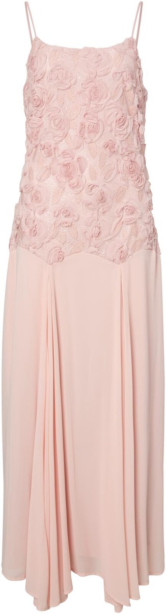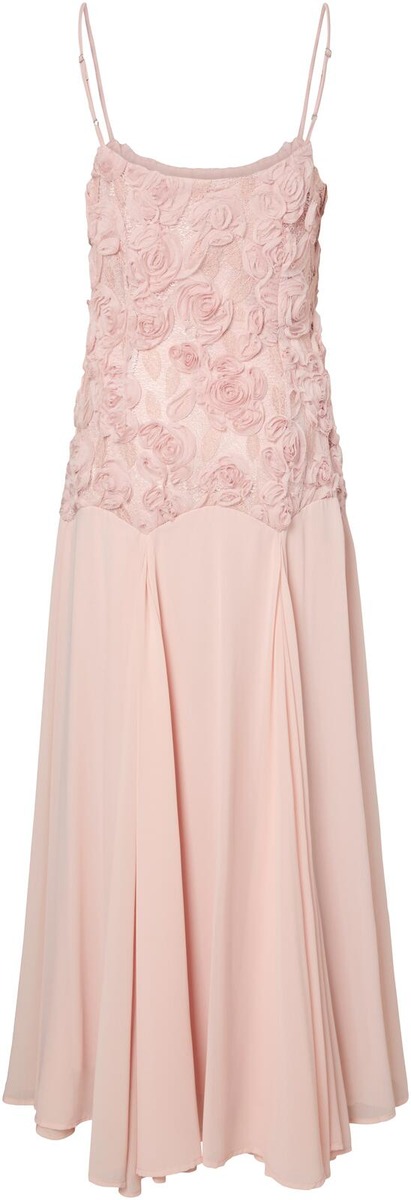 Trendikäs ruusukoristeinen mekko lasketulla vyötärölinjalla. Ohuet olkaimet ja kauniisti laskeutuva helma.