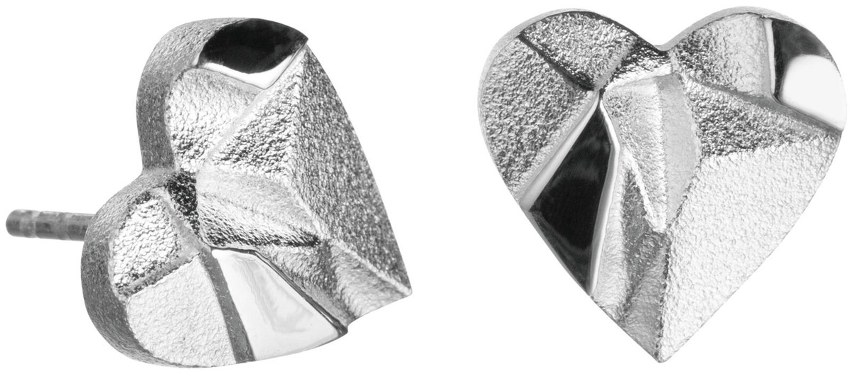Korvakoruissa on vahva viesti oikukkaasta sydämestä, joka ei aina kuuntele järjen ääntä. Björn Weckströmin suunnittelemissa My Foolish Heart -koruissa peilikirkkaan ja himmeän mattaisena hohtavan hopean vuoropuhelu tuo mieleen puhtaan pakkaslumen ja talviauringossa välkehtivän jään. Korvakorut eivät ole toistensa peilikuvat. Tappikiinnitys. Korkeus 10 mm.
