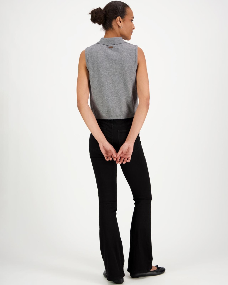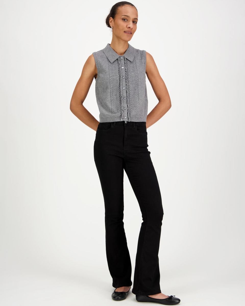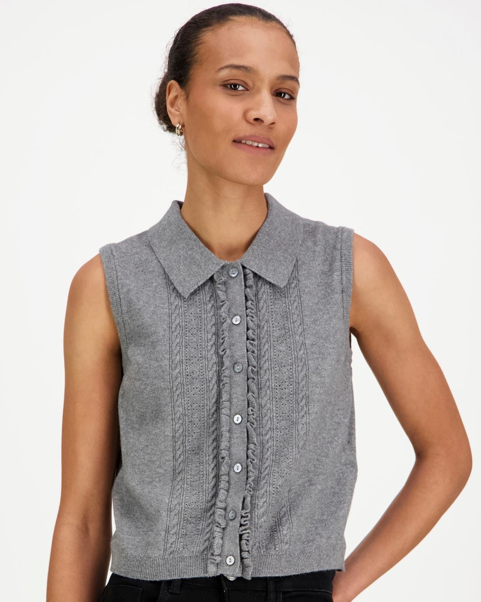 Saat upean trendikkään farkku-asun kun yhdistät tämän suloisen liivin niiden kanssa. Sekoitteessa mukana puuvillaa, polyesteriä, modaalia ja elastaania. Edessä röyhelöt.