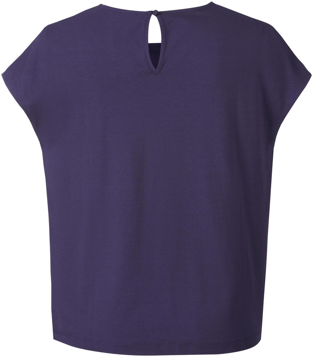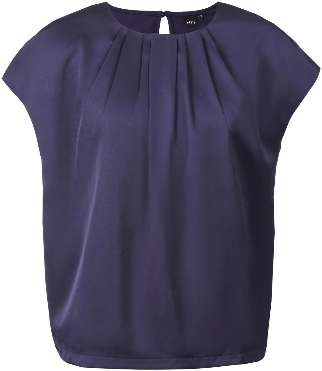Ril's toppi naisille. Olkapään peittävät holkkihihat. Suora malli. Laskostettu pääntie. Pyöreä pääntie. Yhden napin kiinnitys. Halkio takana. Joustava. Satiinia. Hybridi: etukappale kierrätettyä polyesteriä, takakappale neulosta. Tuotteessa on käytetty kierrätettyjä materiaaleja. Vuoriton