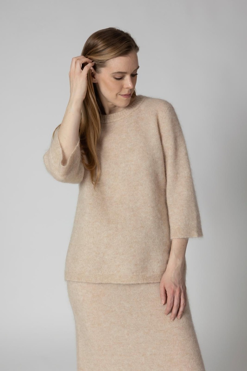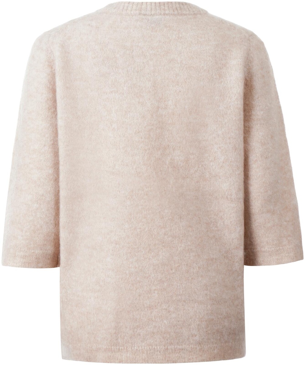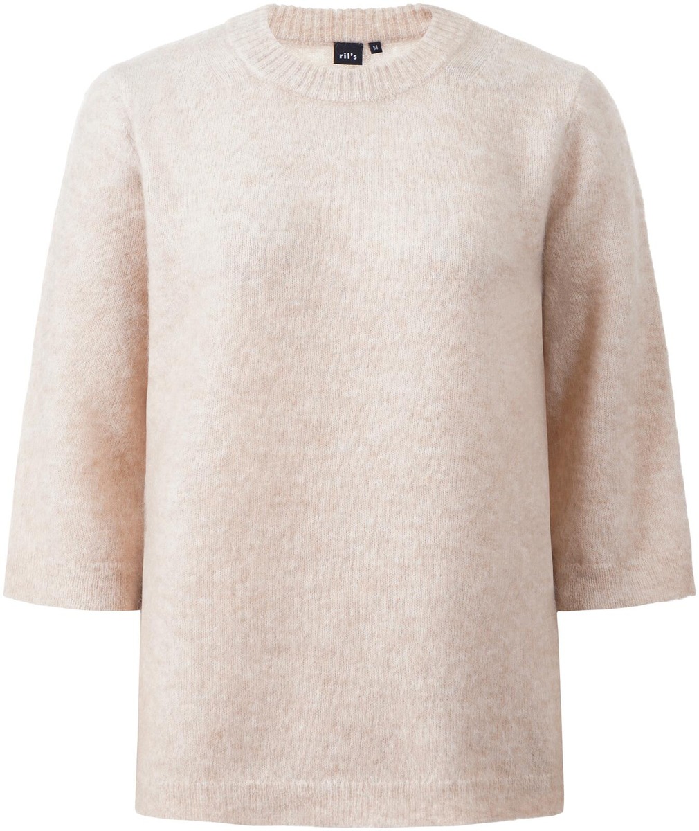 Ril's naisille. Puolipitkät hihat. Resorillinen pyöreä pääntie. Hihansuu ja helma ribbineulosta. Muotoon neulottu. Meleerattu. Pehmeää neulosta. Villa-mohairsekoitetta.
