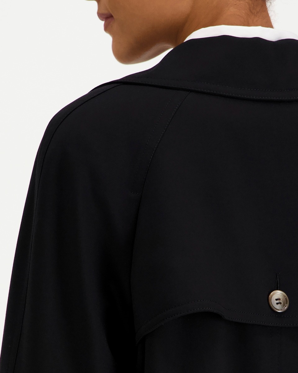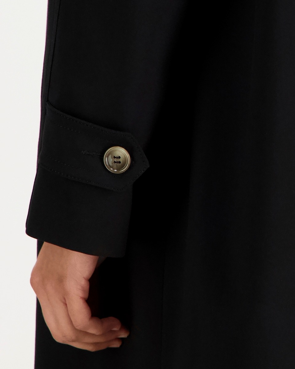 Ril's pitkä takki naisille. Raglan-hihat. Suora leikkaus. Lovikaulus. Tampit hihansuissa. Etutaskut. Kaksirivinen. Olkatoppaukset. Kokovuori.