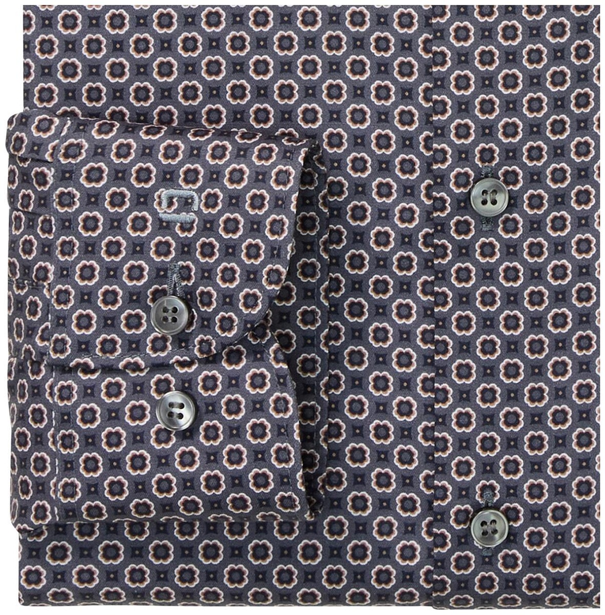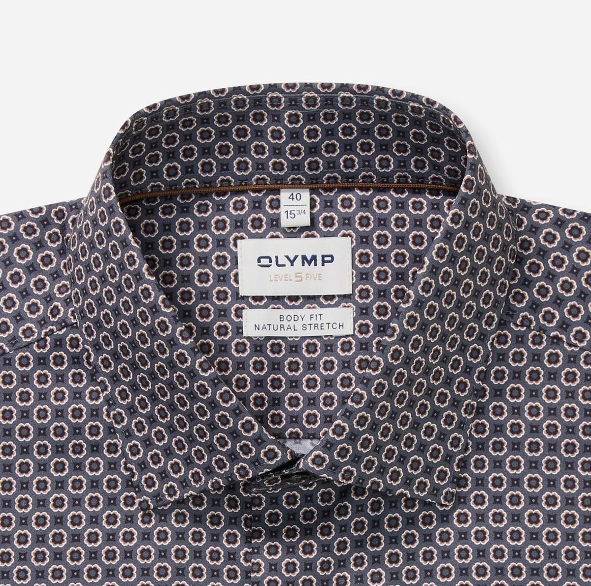 Puuvilla -twillistä valmistettu kuviollinen kauluspaita Level Five -mitituksella. Kapearunkoisen paidan käyttömukavuutta lisää muotolaskokset takana ja materiaalin pieni jousto. Paidassa on New York Kent -kaulus. Vyötärön ympärys 98 cm koissa 39ja 40.