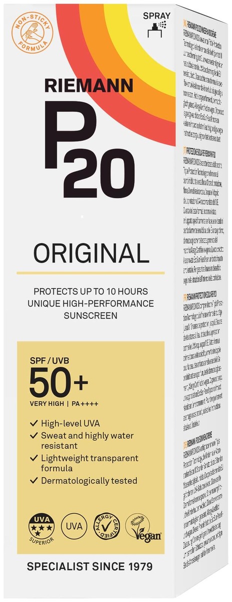 P20 ORIGINAL SPF 50+ -aurinkosuojan Triple Protection Technology antaa suojan jopa 10 tunniksi, on hyvin vedenkestävä ja ylittää EU:n vaatiman UVA-suojaustason. Kevyt ja läpikuultava suoja on helppo levittää, kuivuu nopeasti ja kestää hikoilua. Riemann P20 ORIGINAL on dermatologisesti testattu, AllergyCertified -sertifioitu, ei sisällä lisättyjä hajusteita ja vegaaninen. Aurinkosuoja tehokasta suojaa vaativille.
