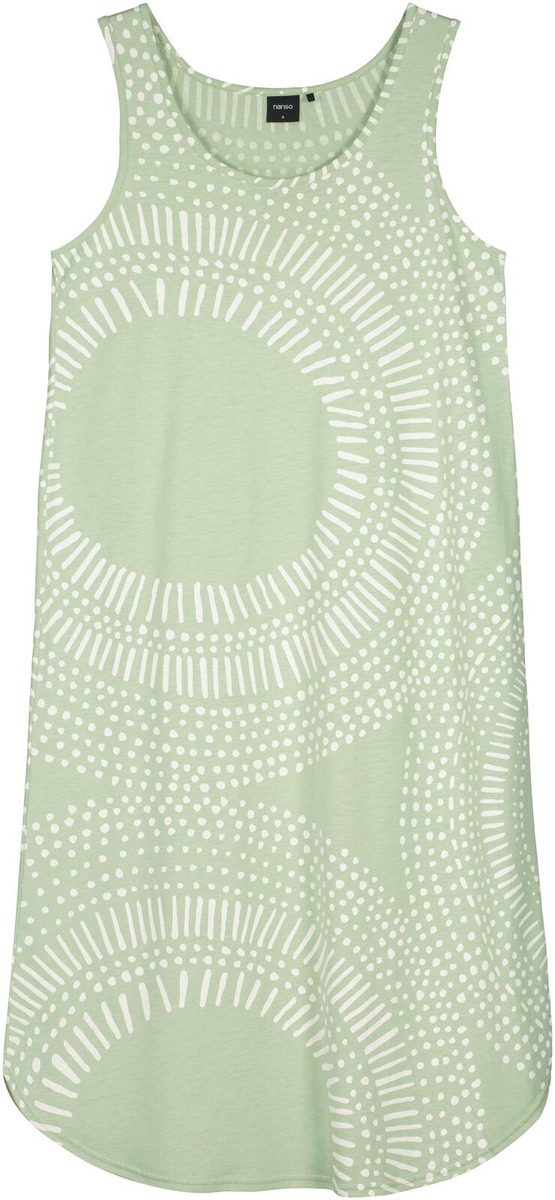 Naisten kuosillinen Aura-yömekko pyöreällä pääntiellä ja pyöristetyllä helmalla. Hihattoman mekon pituus koossa M on noin 115 cm. Materiaali on laadukasta, iholla miellyttävän pehmeältä tuntuvaa ja helppohoitoista puuvilla-modaalia, joka pysyy hyvänä pesusta toiseen.