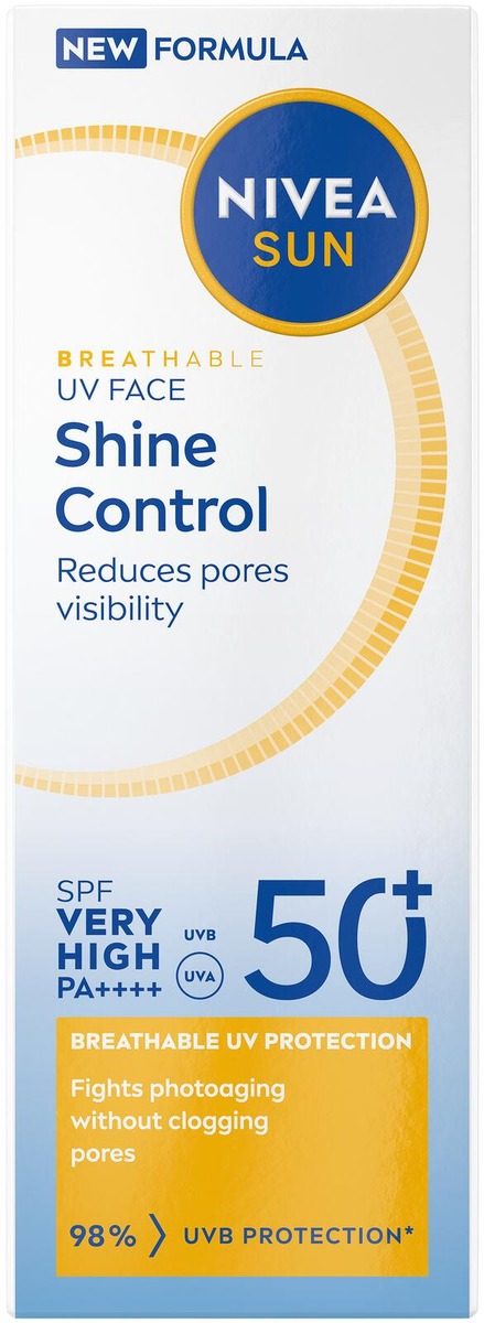 NIVEA SUN UV Face Shine Control Sun Cream SK 50+ -aurinkosuojavoide tarjoaa kasvoille suojaa, joka on enemmän kuin pelkkä suojakerroin. Patentoidulla UV-teknologialla se torjuu auringon aiheuttamaa ikääntymistä tukkimatta ihohuokosia ja tarjoaa 98 %:n UVB-suojan. Miellyttävä, kevyt koostumus antaa ihon hengittää. Aurinkovoide häivyttää näkyvästi ihohuokosia ja hillitsee ihon rasvaisuutta yli 12 tunnin ajan. Karnitiinin, tapiokan ja riisitärkkelyksen ansiosta koostumus tarjoaa 3X Shine Control -vaikutuksen ja välittömän, pitkäkestoisen mattapinnan. Licochalcone A:lla rikastettu koostumus auttaa ehkäisemään UV-säteilyn aiheuttamia vapaita radikaaleja jopa 87 % (in vitro). Kevyt, 0% rasvainen, näkymätön lopputulos iholla. Ei tuki ihohuokosia. Sopii päivittäiseen käyttöön. Testattu ihotauti- ja silmälääkäreiden valvonnassa.