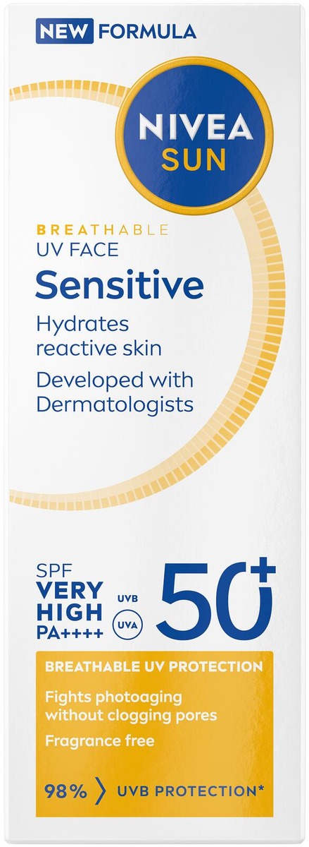 NIVEA SUN UV Face Sensitive Sun Cream SK50+ -aurinkosuojavoide tarjoaa kasvoille suojaa, joka on enemmän kuin pelkkä suojakerroin. Patentoidulla UV-teknologialla se torjuu auringon aiheuttamaa ikääntymistä tukkimatta ihohuokosia ja tarjoaa 98 %:n UVB-suojan. Miellyttävä, kevyt koostumus antaa ihon hengittää. Herkälle iholle sopiva aurinkovoide on kehitetty yhdessä ihotautilääkärien kanssa, ja se kosteuttaa helposti reagoivaa ihoa ja auttaa ehkäisemään aurinkoärsytystä. Hajusteeton koostumus sisältää pantenolia, glyseriiniä ja Licochalcone A:ta. Antaa iholle 3X Sensitive Protect suojan, joka kosteuttaa tehokkaasti ihoa ja rauhoittaa sitä. Auttaa ehkäisemään UV-säteilyn aiheuttamia vapaita radikaaleja jopa 87% (in vitro). Kevyt, 0% rasvainen, näkymätön lopputulos iholla. Ei tuki ihohuokosia. Sopii päivittäiseen käyttöön. Testattu ihotauti- ja silmälääkäreiden valvonnassa.