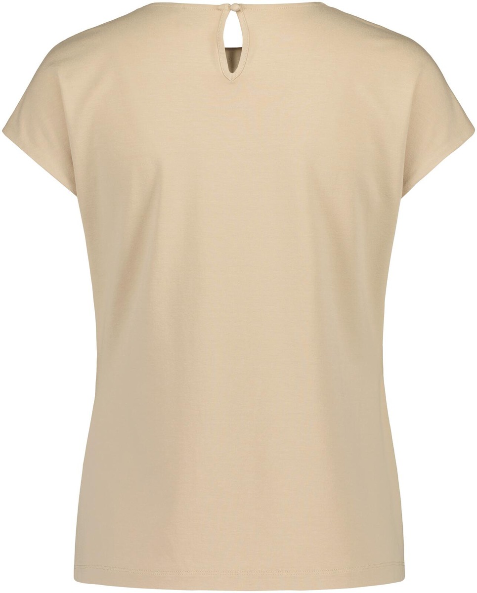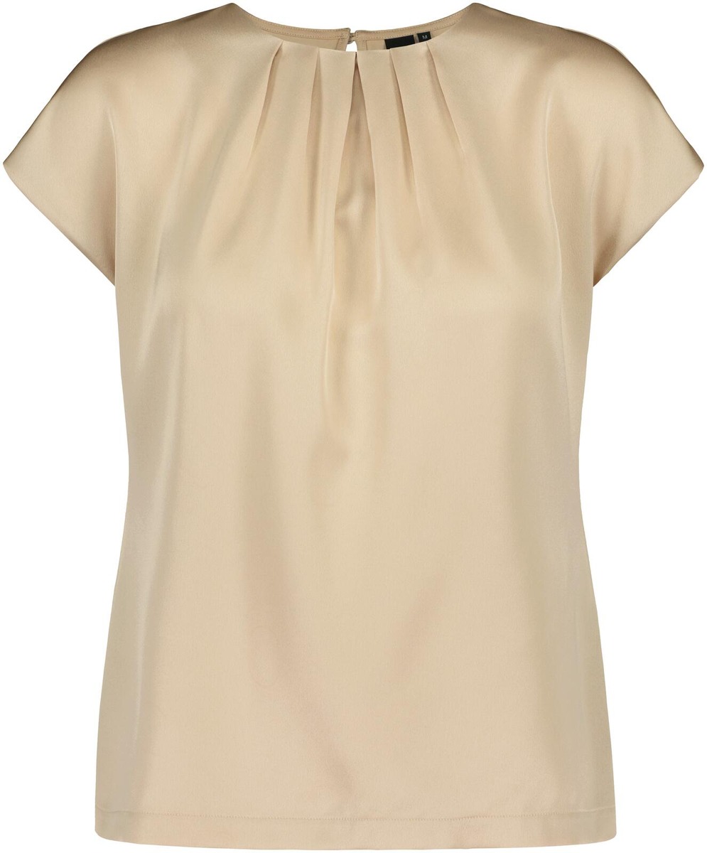 Kahden eri kankaan topissa on pienet holkkihihat, pääntiessä näyttäviä laskosyksityiskohtia ja takana niskahalkiossa nappikiinnitys. Kiiltävä etuosa on kauniisti laskeutuvaa, kierrätettyä polyesterisatiinia. Takaosa on miellyttävän joustavaa viskoosielastaania. Takapituus on 60 cm koossa M.