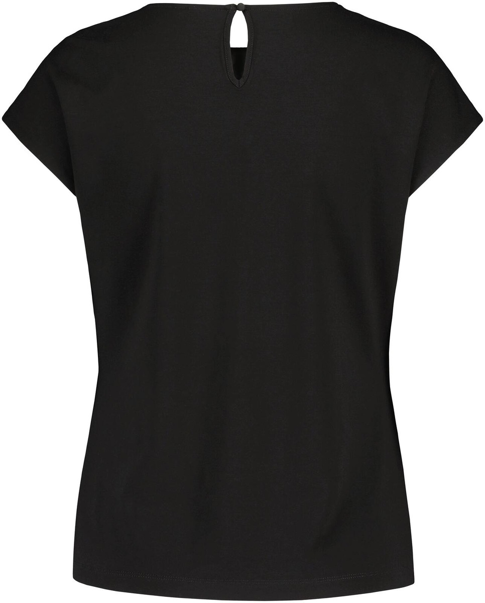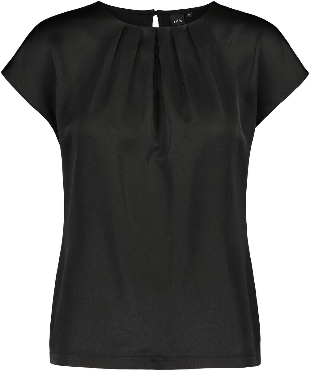 Kahden eri kankaan topissa on pienet holkkihihat, pääntiessä näyttäviä laskosyksityiskohtia ja takana niskahalkiossa nappikiinnitys. Kiiltävä etuosa on kauniisti laskeutuvaa, kierrätettyä polyesterisatiinia. Takaosa on miellyttävän joustavaa viskoosielastaania. Takapituus on 60 cm koossa M.
