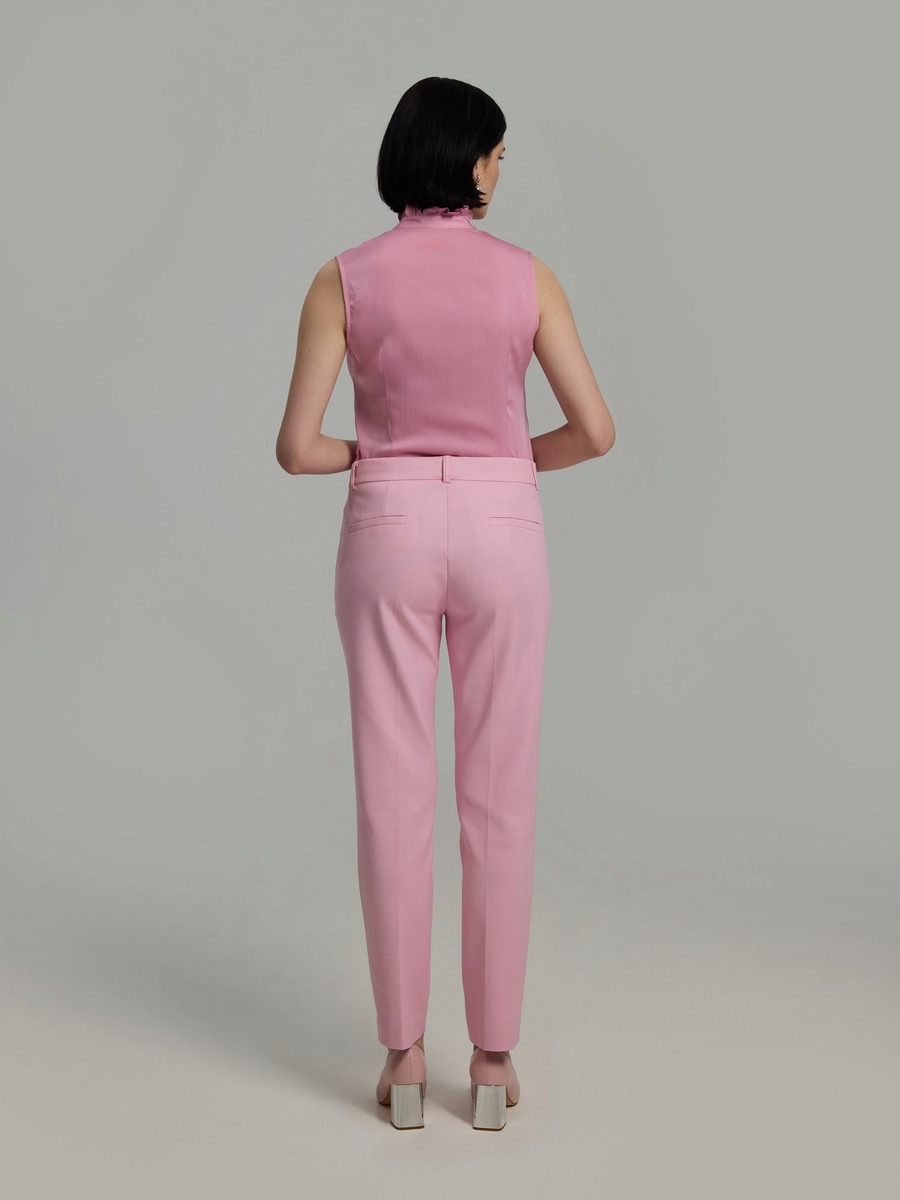 Klassiset nilkkapituiset, kapealinjaiset mustat housut napakasta ja joustavasta jersey-kankaasta. Keskikorkea vyötärö, vyölenkit ja sivutaskut. Vetoketju sekä piilotettu hakas- ja nappikiinnitys edessä.