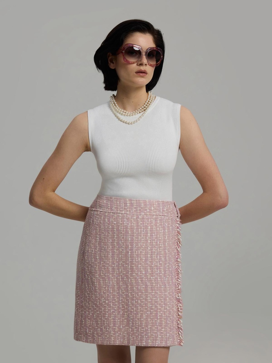 Hihaton ribbitoppi, jossa istuva siluetti, leveät olat ja pyöreä pääntie.