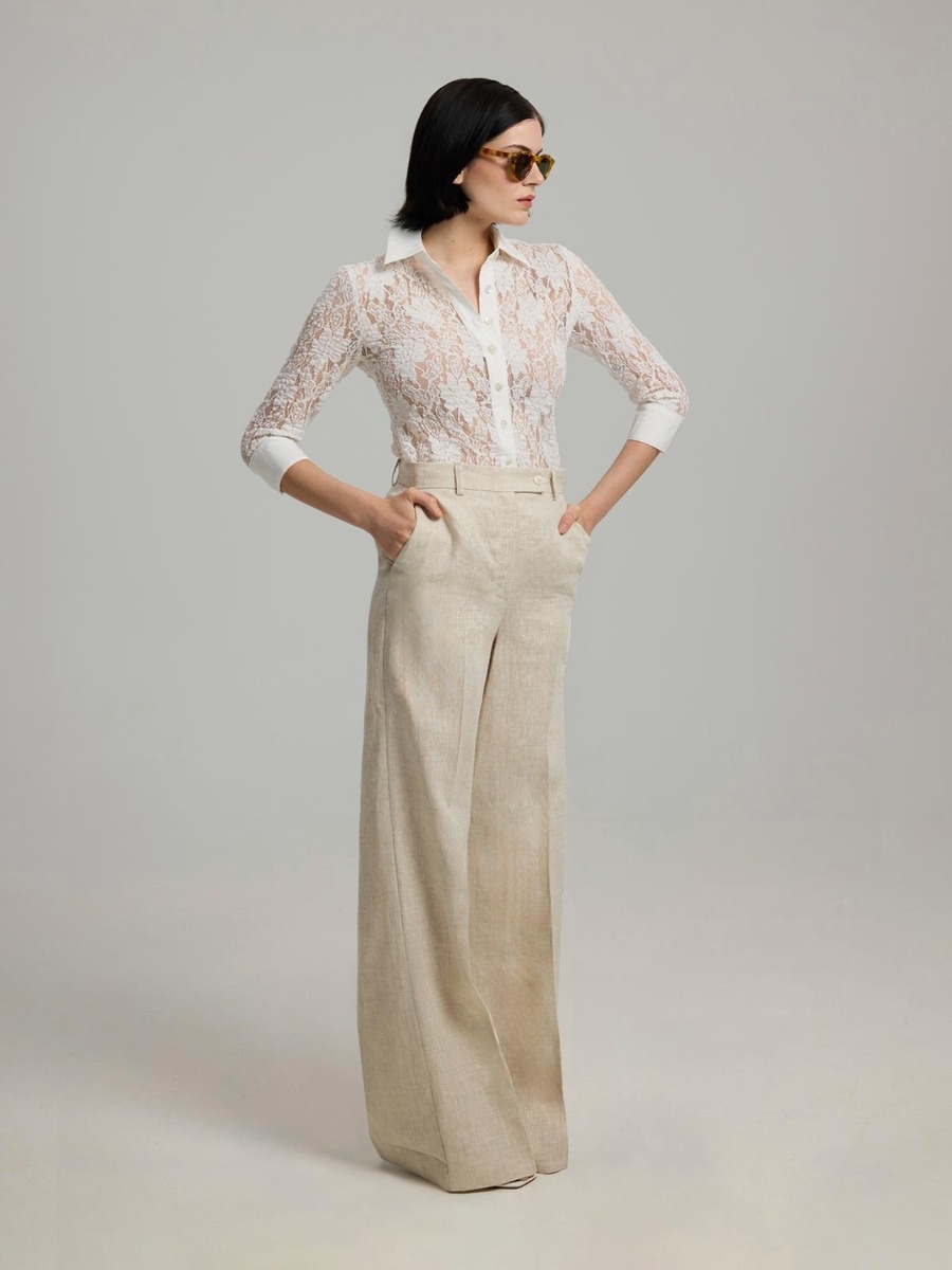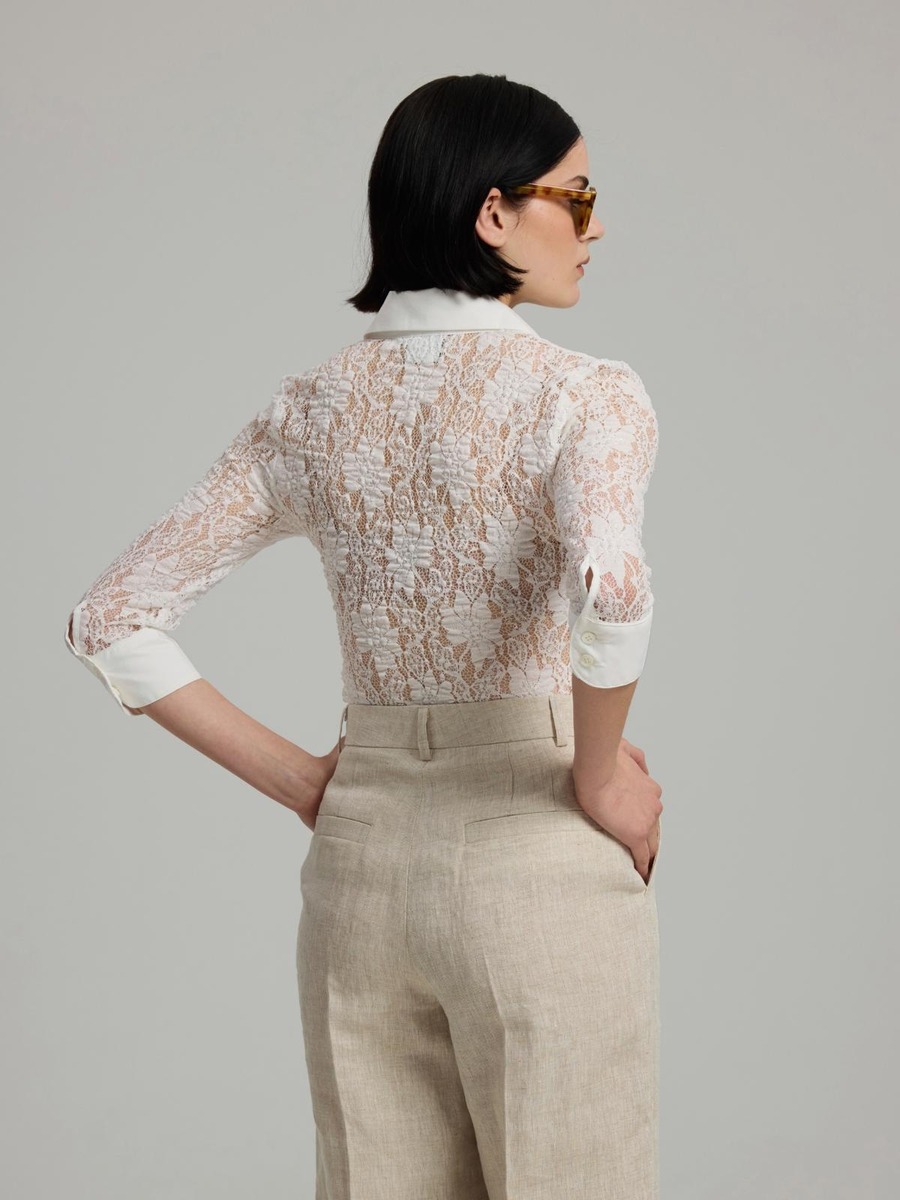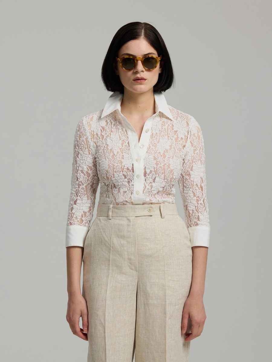 Hienoverkkoinen pitsipaita, jossa on vajaamittaiset hihat, napit ja kaulusyksityiskohdat.