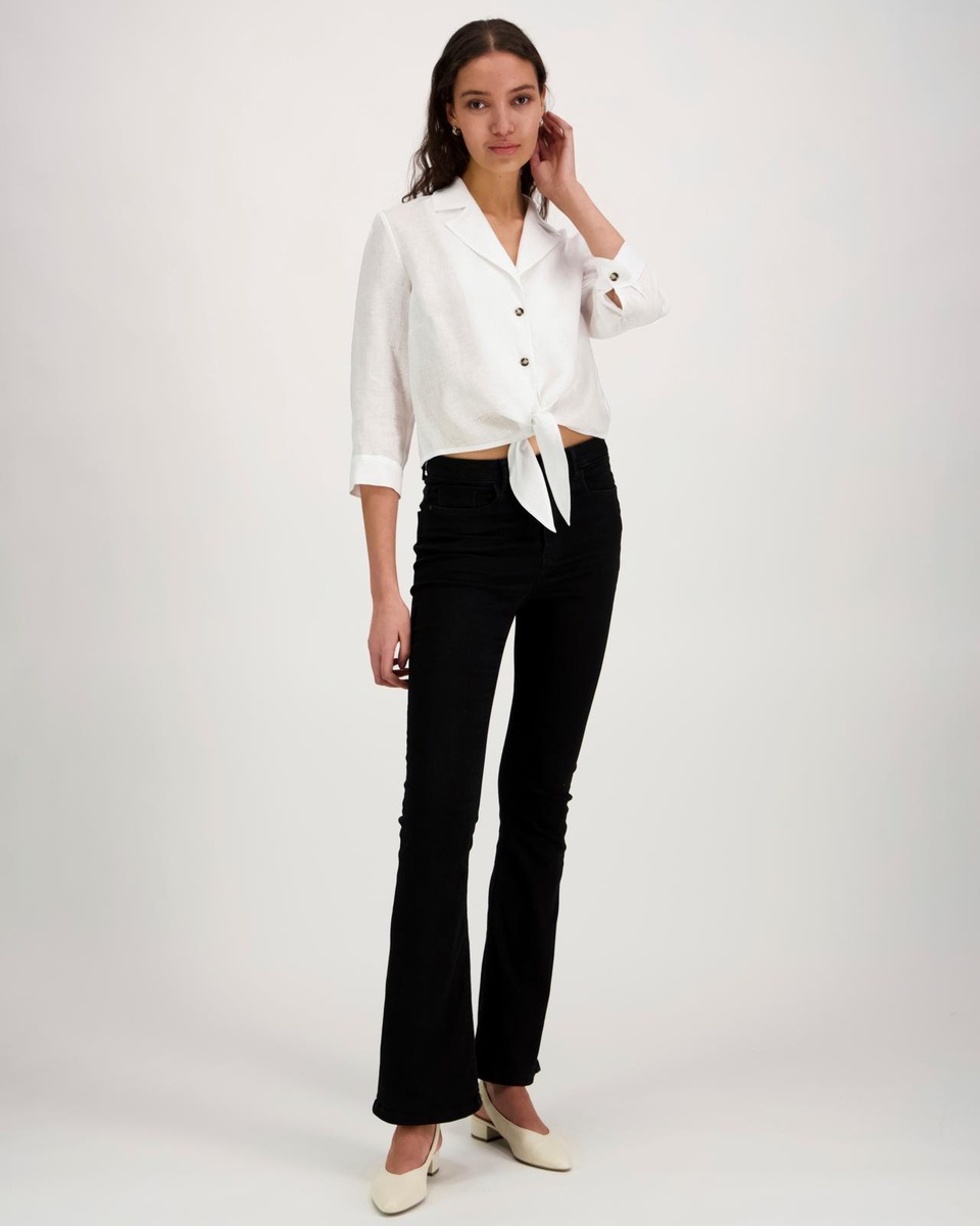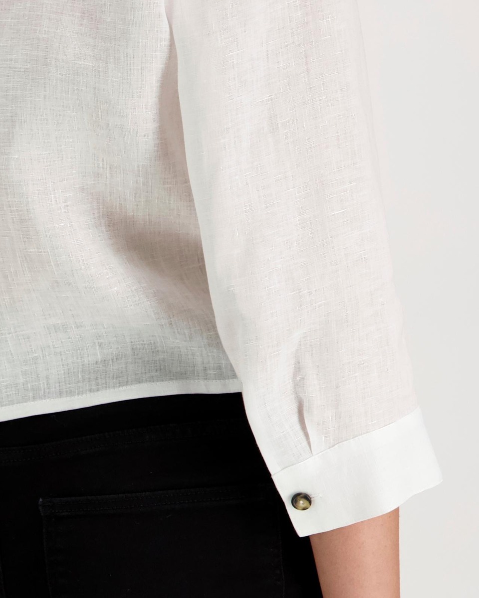 Edestä napitettava ja sidottava pellavapaita 3/4 pituisilla hihoilla.