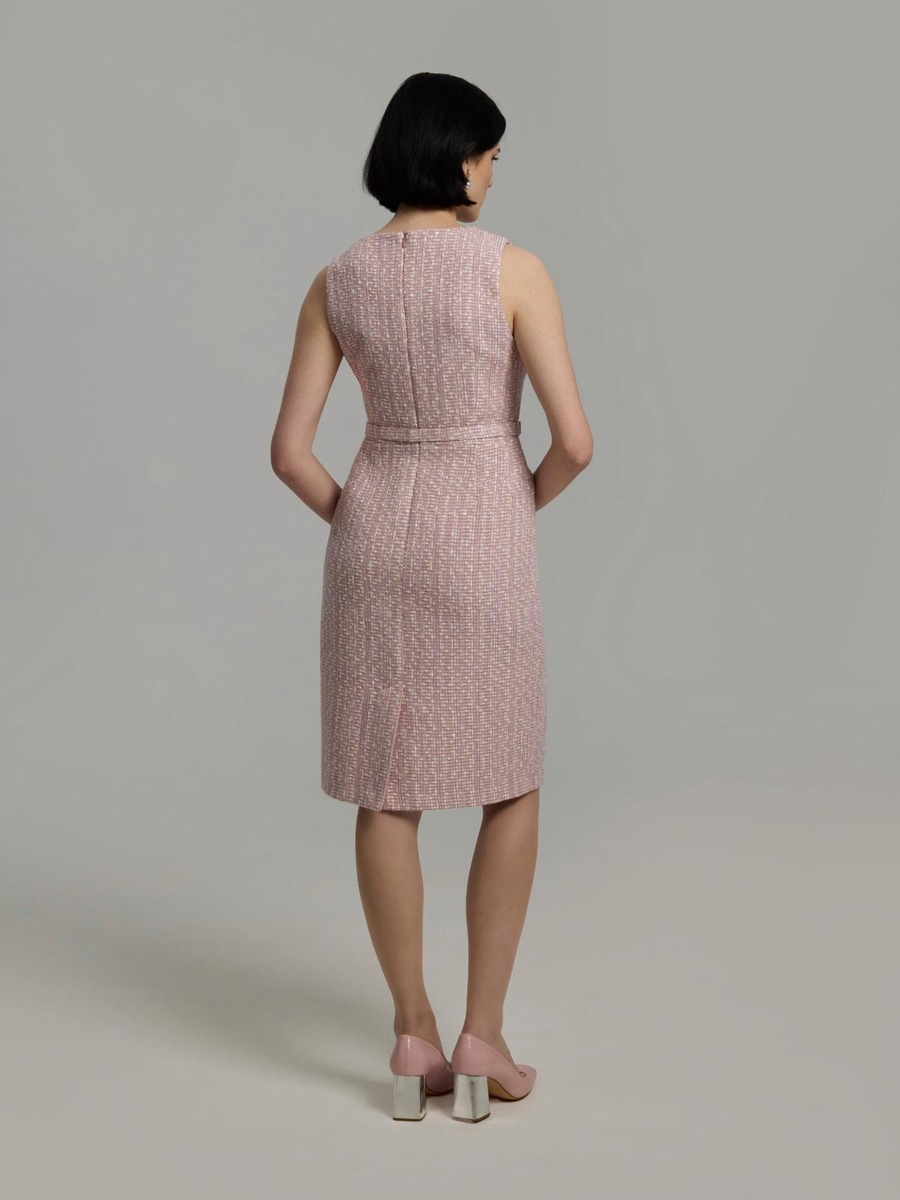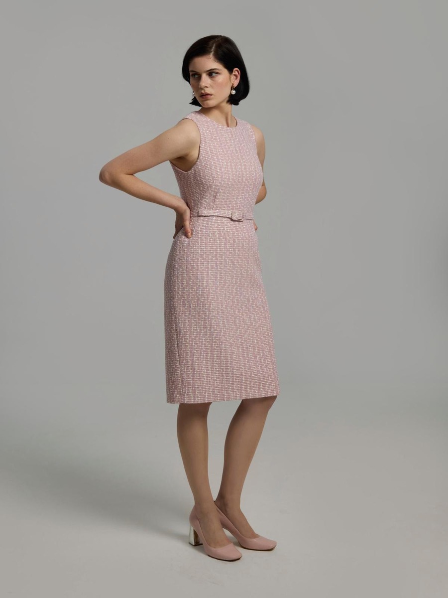 Hihaton bouclé-mekko pyöreällä pääntiellä ja kangaspäällysteisellä irrotettavalla vyöllä.
