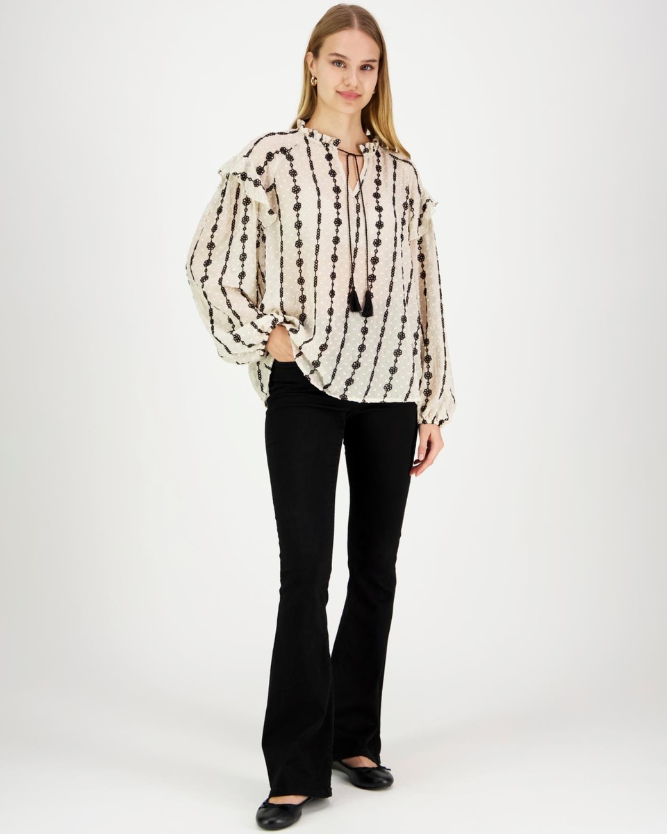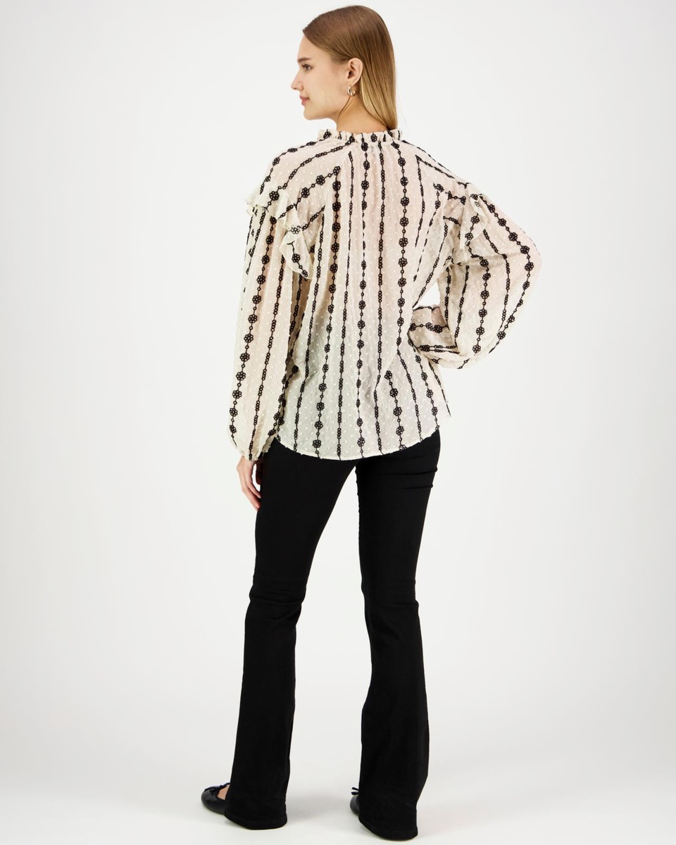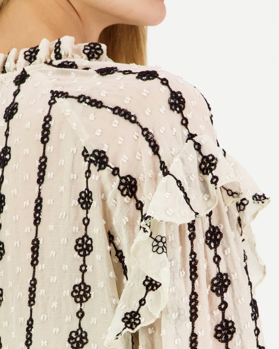 Kauniisti brodeerattu sifonkipusero. Hihoissa on kuminauhat.