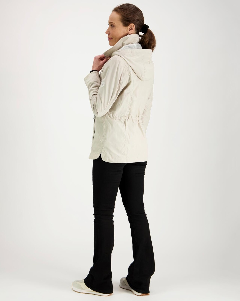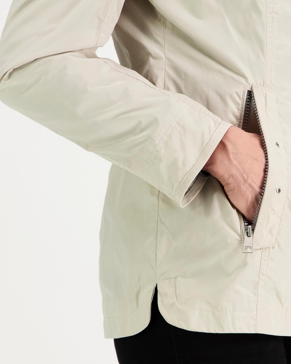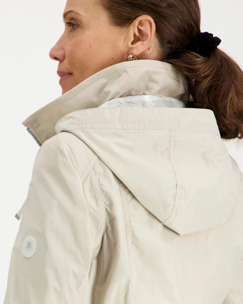Tämä hupullinen takki yhdistää klassisen tyylin ja modernin käytännöllisyyden. Ulkopuolella kaunis beige sävy ja sisäpuolella tyylikäs ruudullinen vuori, joka tuo asuun persoonallista ilmettä. Kiinteä huppu kiristysnyöreillä suojaa tuulelta ja sateelta, ja edessä oleva vetoketju yhdistettynä painonappilistaan tekee takista turvallisen ja mukavan käyttää.