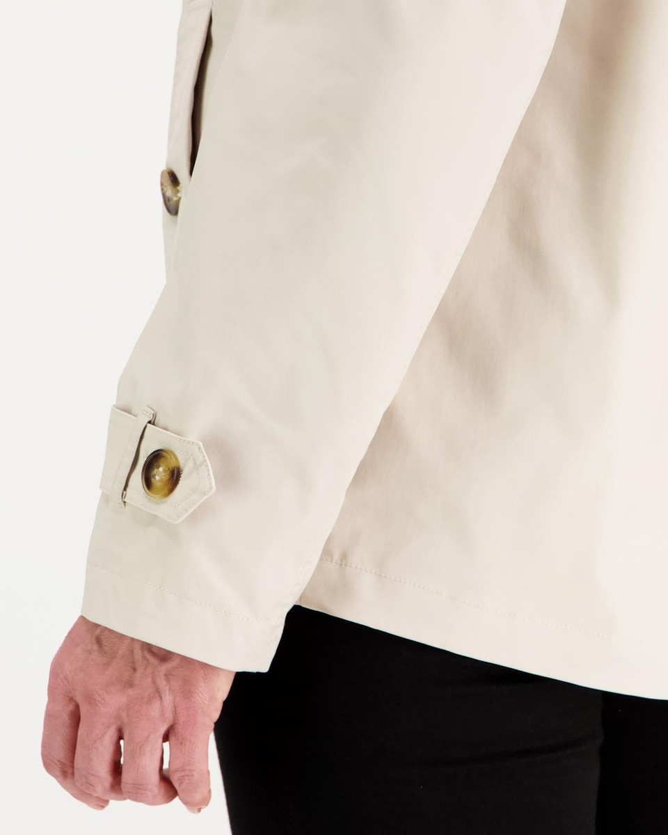Tämä tyylikäs trench-takki on täydellinen valinta sinulle, joka arvostat klassista muotoilua ja monikäyttöisyyttä. Vaalea beige sävy tuo raikkautta ja eleganssia asuun, ja huolellisesti suunnitellut yksityiskohdat, kuten nappikiinnitys, kaulus ja hihansuiden säätöremmit, tekevät takista viimeistellyn ja käytännöllisen. Pituus on noin 72 cm, mikä antaa takille kauniin siluetin ja tekee siitä helpon yhdistää niin housujen kuin mekkojen kanssa.
