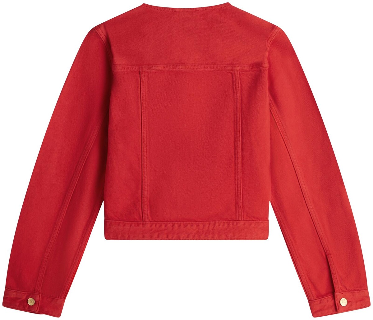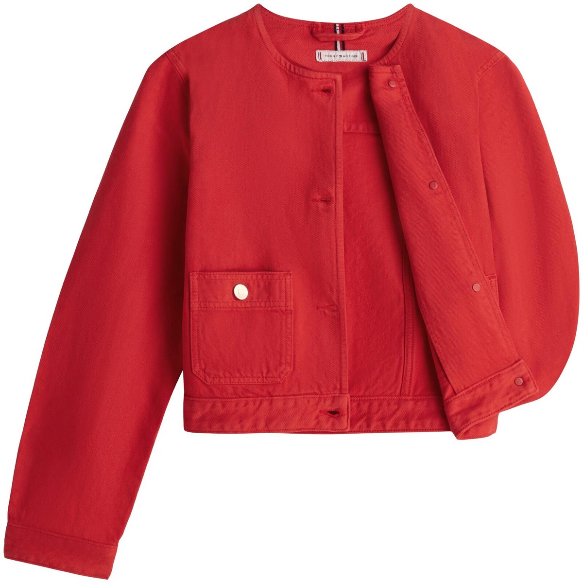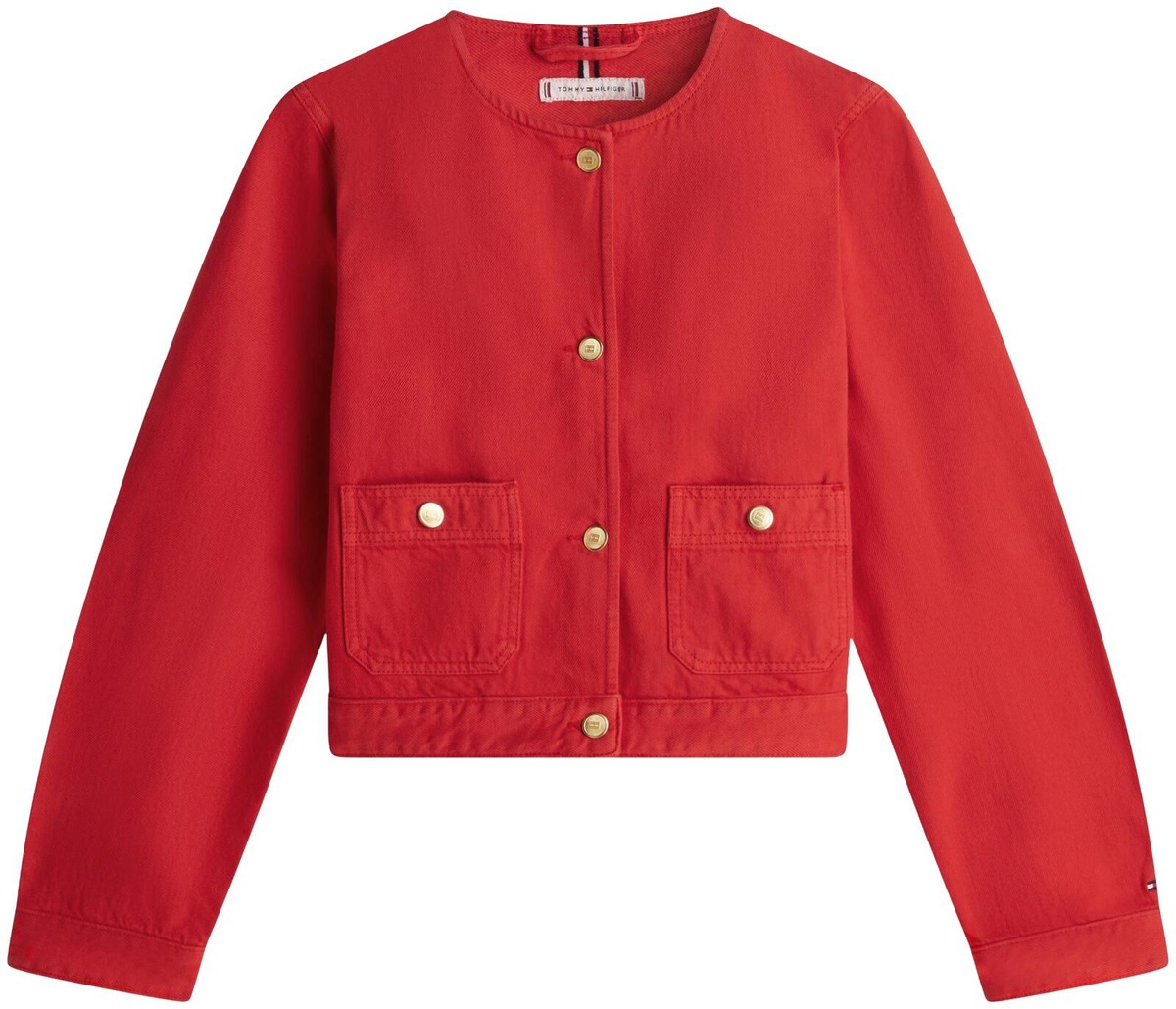 Tommy Hilfiger lyhyt jakku, kaulukseton, kultaiset merkkinapit, twill-materiaali ja kaksi etutaskua.