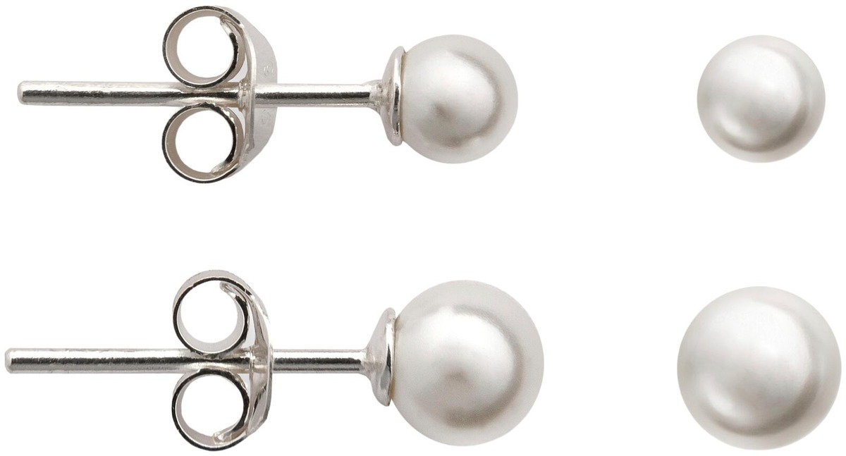 Helmikorvakorusetti, jossa on 4 mm ja 6 mm halkaisijaltaan olevat valkoiset synteettiset helmet. Tappikiinnitus hopeaa.