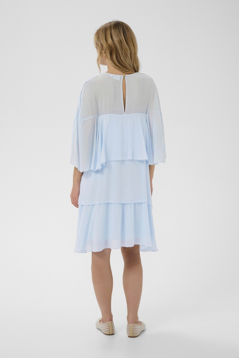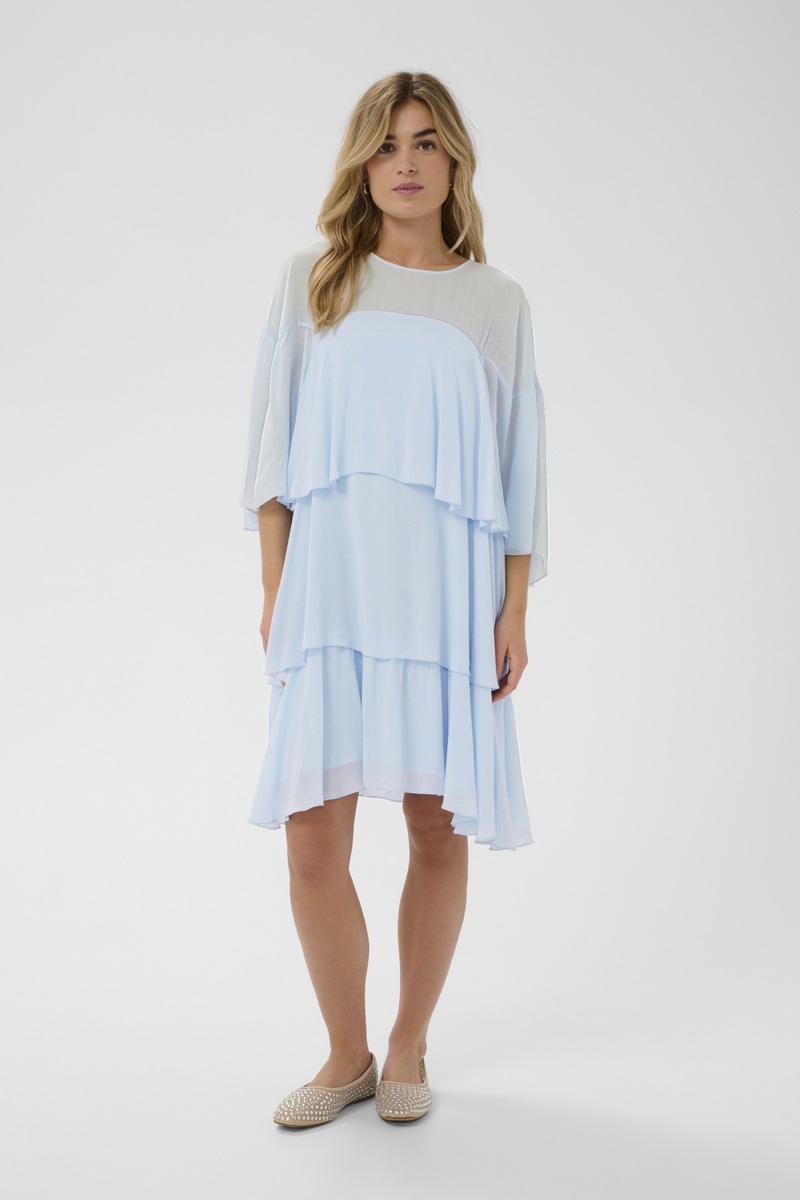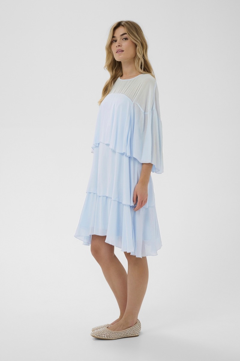 Pehmeä ja ilmava, unenomaisella siluetilla varustettu mekko huokuu rentoa eleganssia. Kerroksellinen malli luo vaivattoman liikkeen.