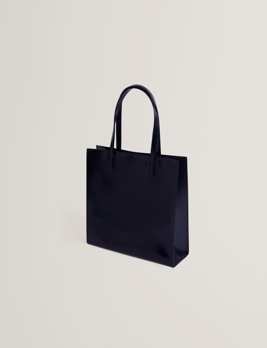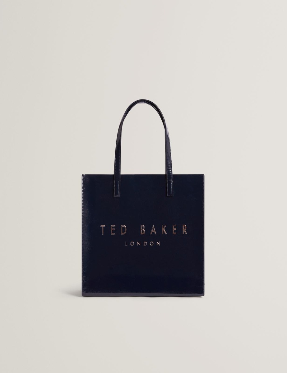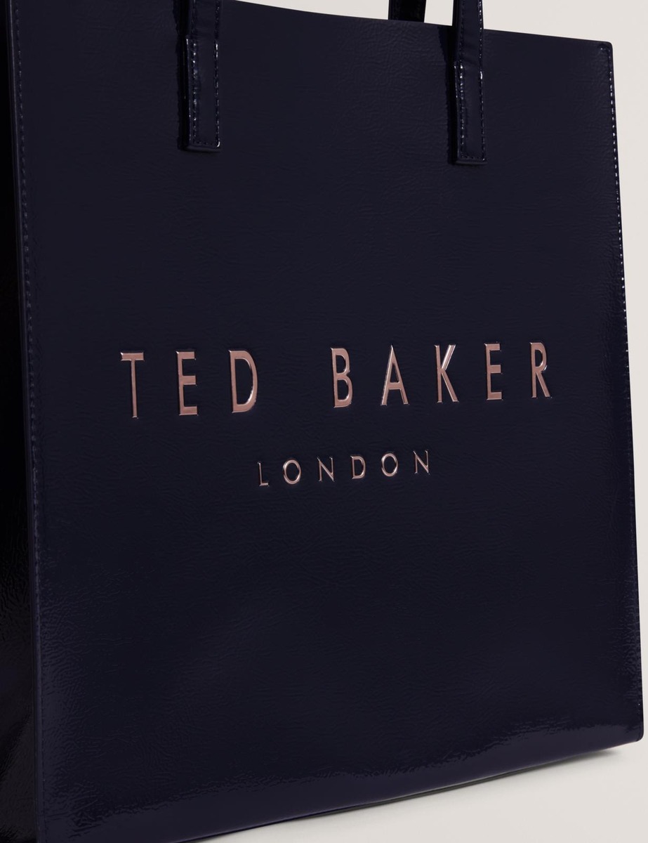 Tummansininen killtävä keinonahkapinta. Sisäpuolella kukkakuosi. Sisällä vetoketjutasku. Olkakahvat. Painettu lila Ted Baker logo.