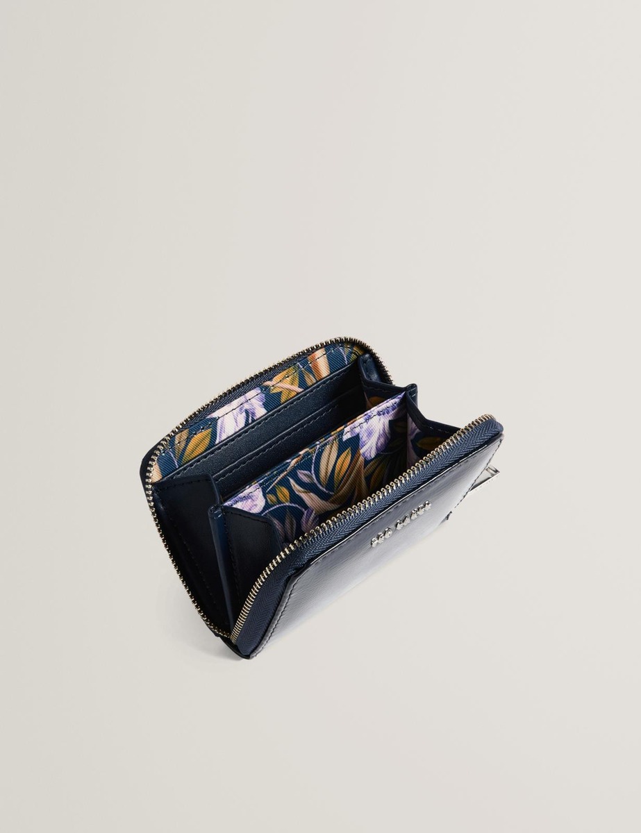 Kiiltävä pinta, sisällä kukkakuosi. Sisällä 7 korttipaikkaa, 2 lokeroa, edessä korttitasku. Suljetaan vetoketjulla.