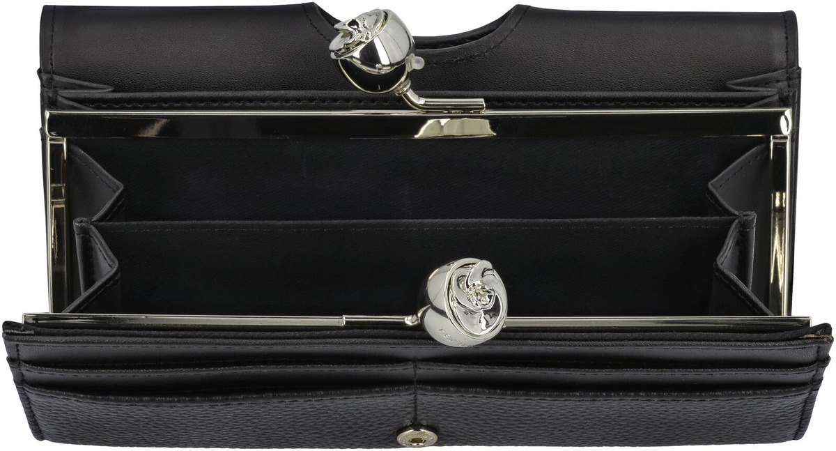 Läpällisen lompakon sisällä on 8 korttilokeroa, joista yksi kuvapaikallinen. 2 avolokeroa, joihin mahtuu vaikka kännykkä. Ruusukoristeisella soljilla suljettava 2 osainen kolikkolokero. Takana vetoketjutasku.