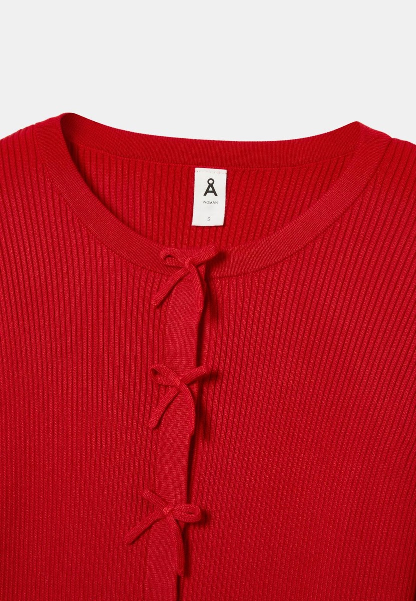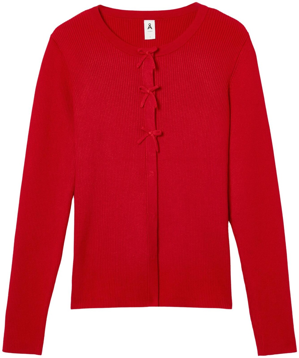 Tyylikäs ribbineulottu neuletakki, jossa on pyöreä pääntie ja edessä värisävyyn sopivat, kiinteästi ommellut rusetit. Neuletakki on valmistettu pehmeästä viskoosisekoitteesta ja siinä on pitkät hihat sekä joustavat ribbimansetit hihansuissa, pääntiellä ja helmassa. Malli on normaalisti istuva ja sopii moniin asukokonaisuuksiin.