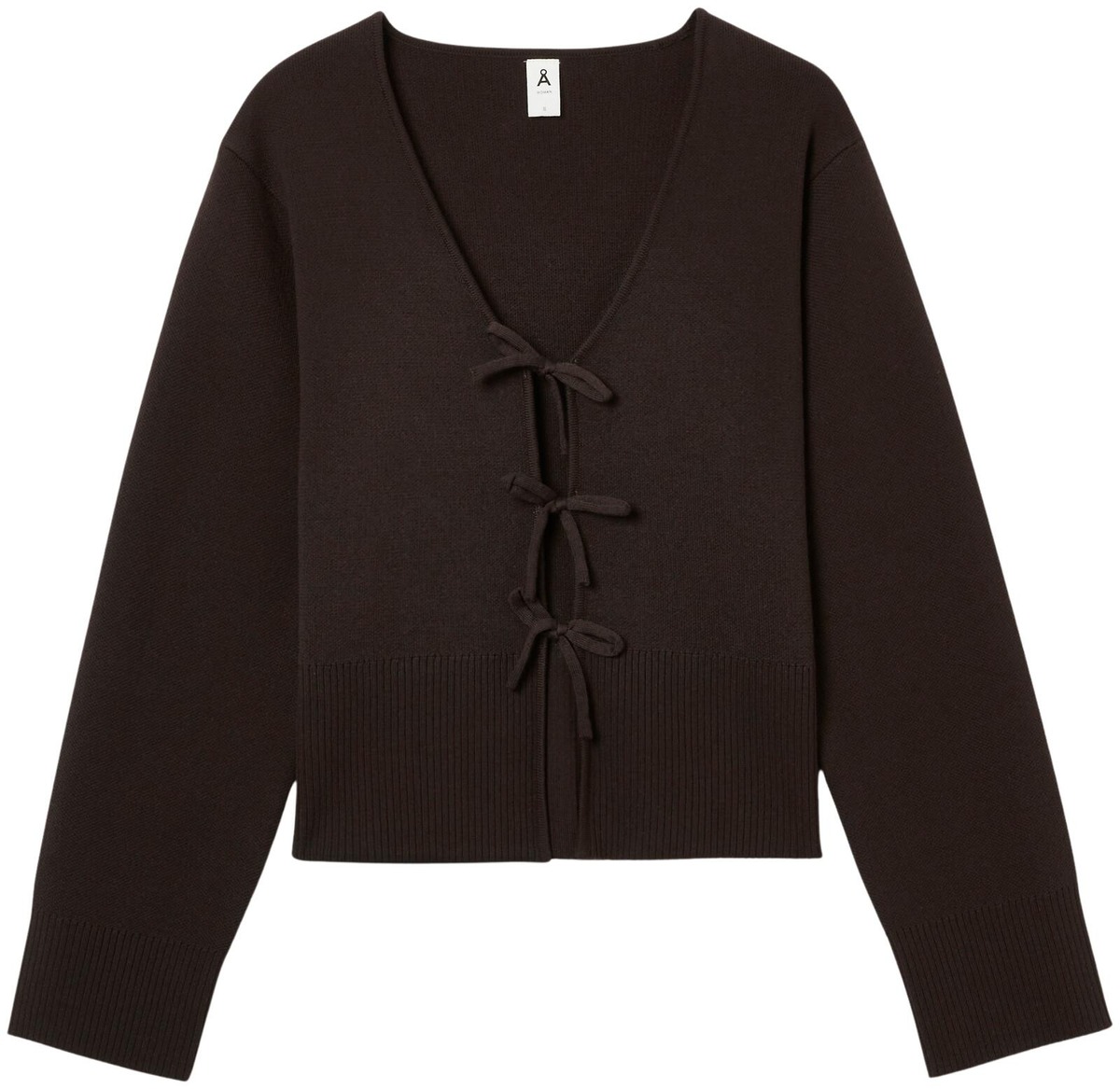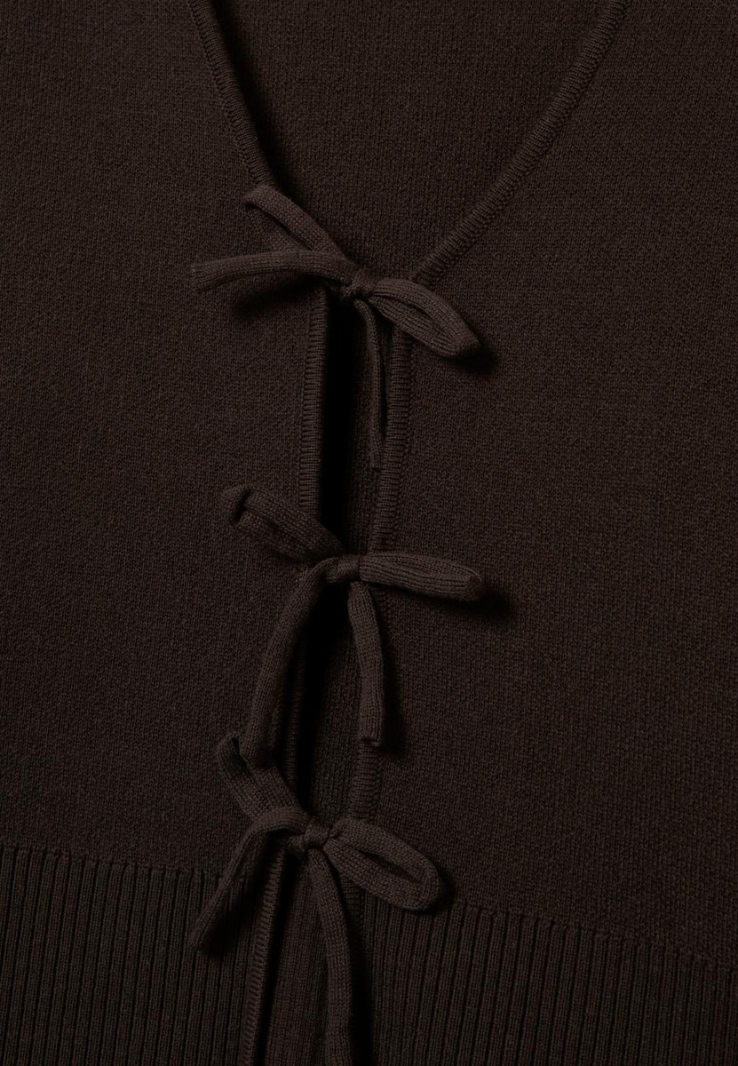 KERSTIN-neuletakki on sileäneulottu ja siinä on edessä tyylikkäät solmittavat nauhat. Neuletakissa on rento istuvuus, suorat hihat sekä leveät ribbineulotut resorit hihansuissa ja helmassa. V-pääntie ja overlock-tikkaus reunassa viimeistelevät ilmeen. Tämä neuletakki yhdistää mukavuuden ja modernin tyylin arkeen.