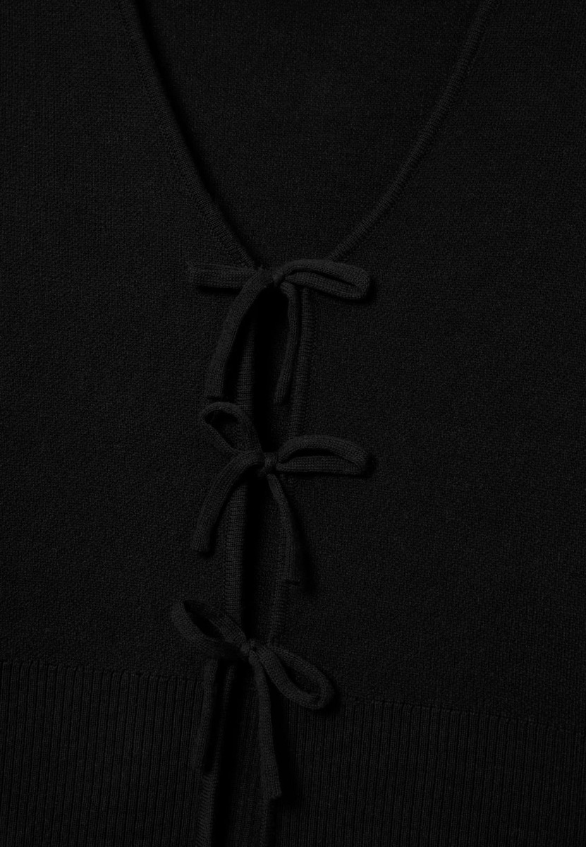 KERSTIN-neuletakki on sileäneulottu ja siinä on edessä tyylikkäät solmittavat nauhat. Neuletakissa on rento istuvuus, suorat hihat sekä leveät ribbineulotut resorit hihansuissa ja helmassa. V-pääntie ja overlock-tikkaus reunassa viimeistelevät ilmeen. Tämä neuletakki yhdistää mukavuuden ja modernin tyylin arkeen.