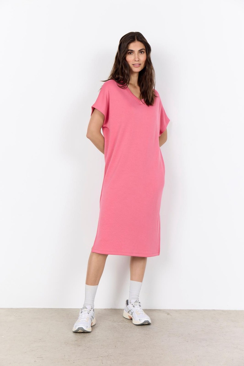 SC-BANU 296 -mekko on valmistettu 48 % modalista, 48 % polyesteristä ja 4 % elastaanista. Mekossa on V-pääntie ja lyhyet hihat, ja sen pinta on miellyttävän sileä. Yhdistä se tennareihin rennon tyylin luomiseksi tai korkokenkiin, jos haluat elegantin vaikutelman.