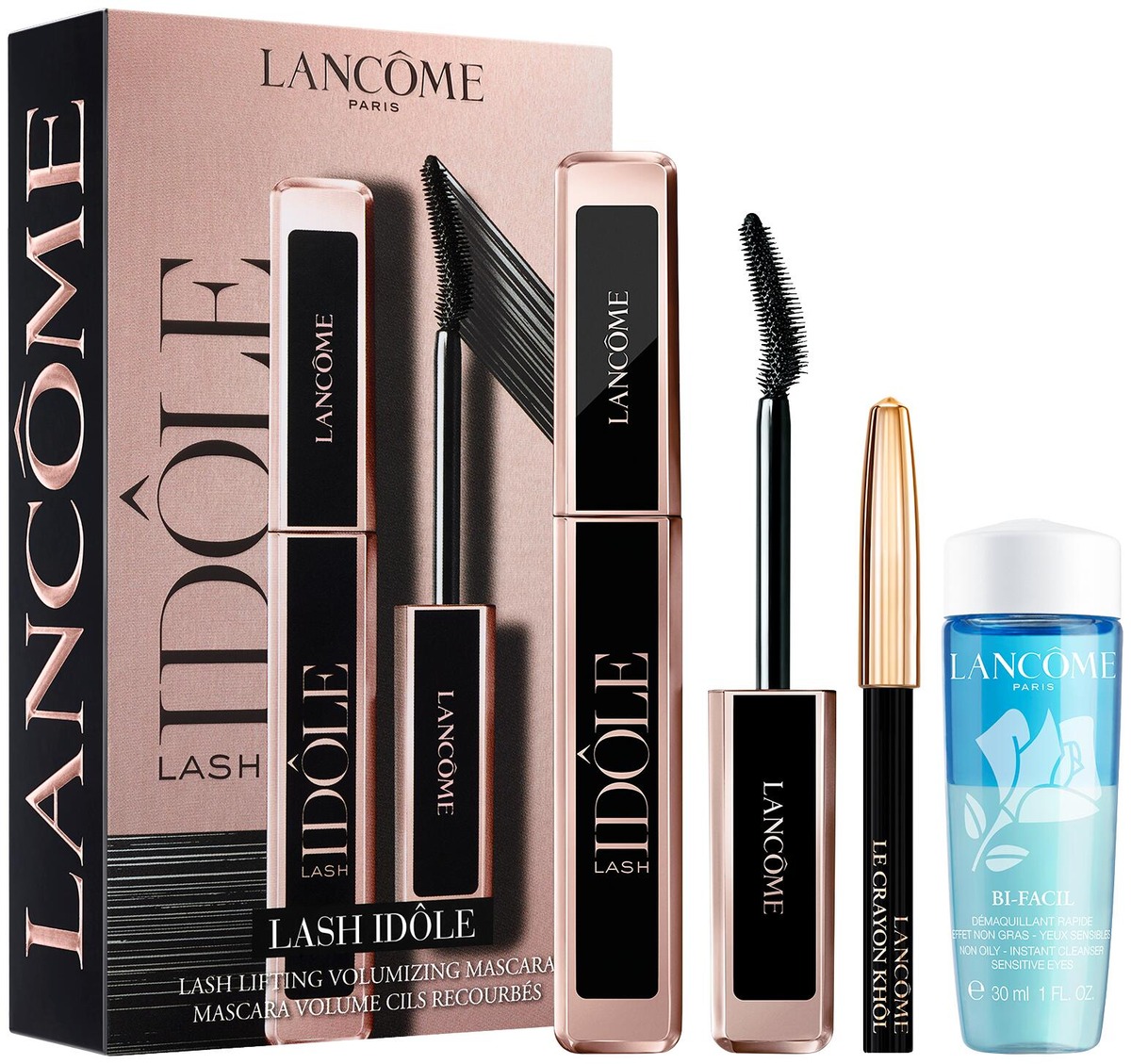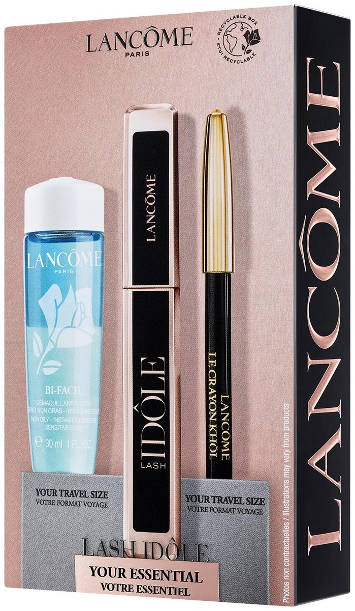Setti sisältää Lash Idôle Mascara 01 Glossy Black - 8 ml, Le Crayon Khôl eyeliner -kynä mini 01 noir - 0,7 g, ja Bi-Facil silmämeikinpoistoaine 30 ml.