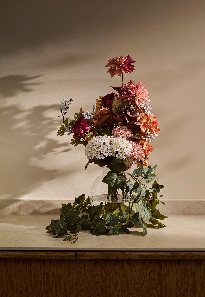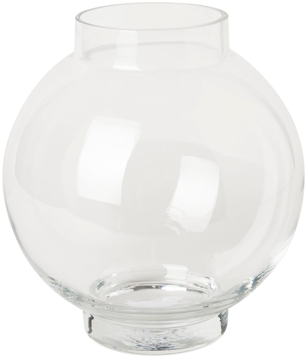 Pyöreä lasimaljakko, jossa on kapeampi suuaukko. DAHLIA sopii kokonaisille kimpuille, joissa on esimerkiksi daaliaa, eukalyptusta ja hortensiaa. Mitat: Korkeus: 26 cm, Halkaisija: 24 cm, Aukon halkaisija: 12 cm