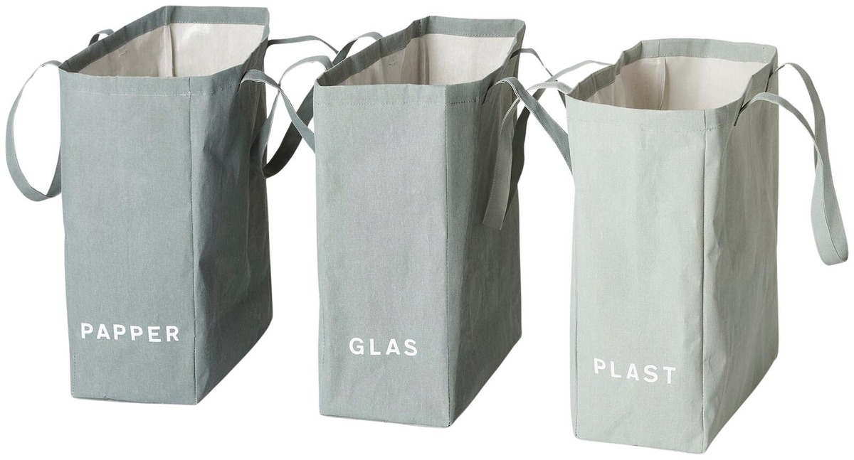 Puuvillakankaasta valmistetut lajittelukassit, täydelliset lajitteluun. Kolmen tilavan kassin sarja, joissa on painetut etiketit helppoa lajittelua varten. Mitat: Pituus: 39 cm, Korkeus: 44 cm, Syvyys: 17 cm