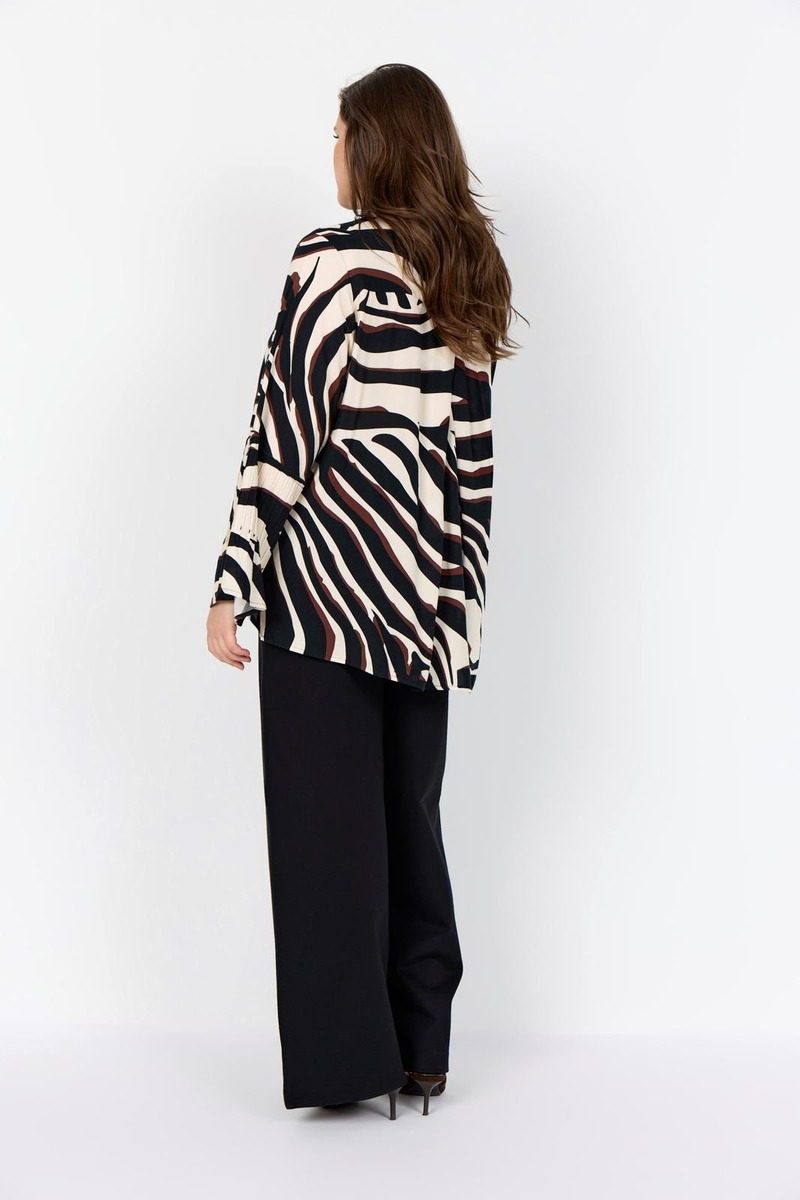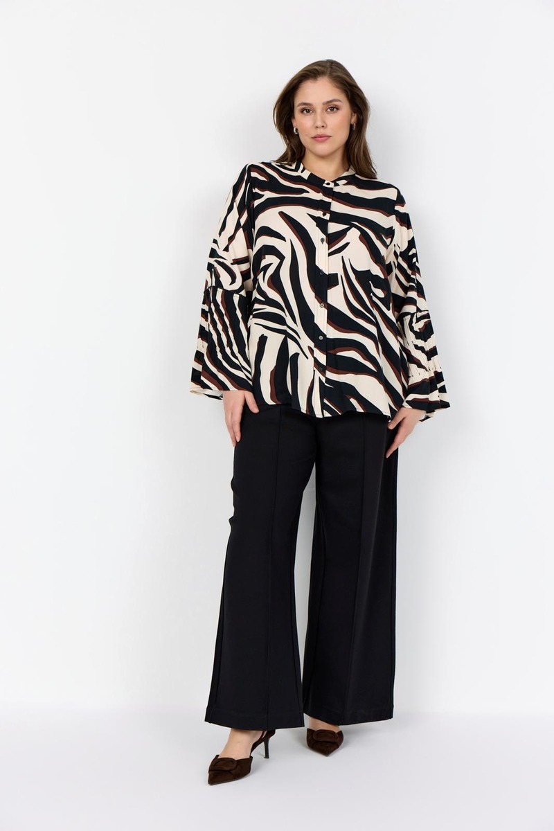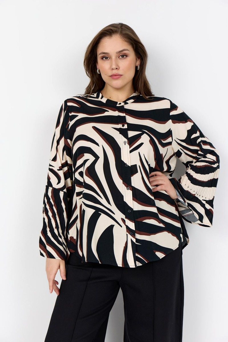 WA-SALMA 2 on tyylikäs paita, joka on valmistettu 100 % LENZING™ ECOVERO™ -viskoosista. Paidassa on pyöreä pääntie, nappikiinnitys edessä, pitkät hihat sekä rohkea seeprakuosi. Yhdistä siisteihin housuihin saadaksesi elegantin ilmeen tai farkkuihin rennompaa tyyliä varten.