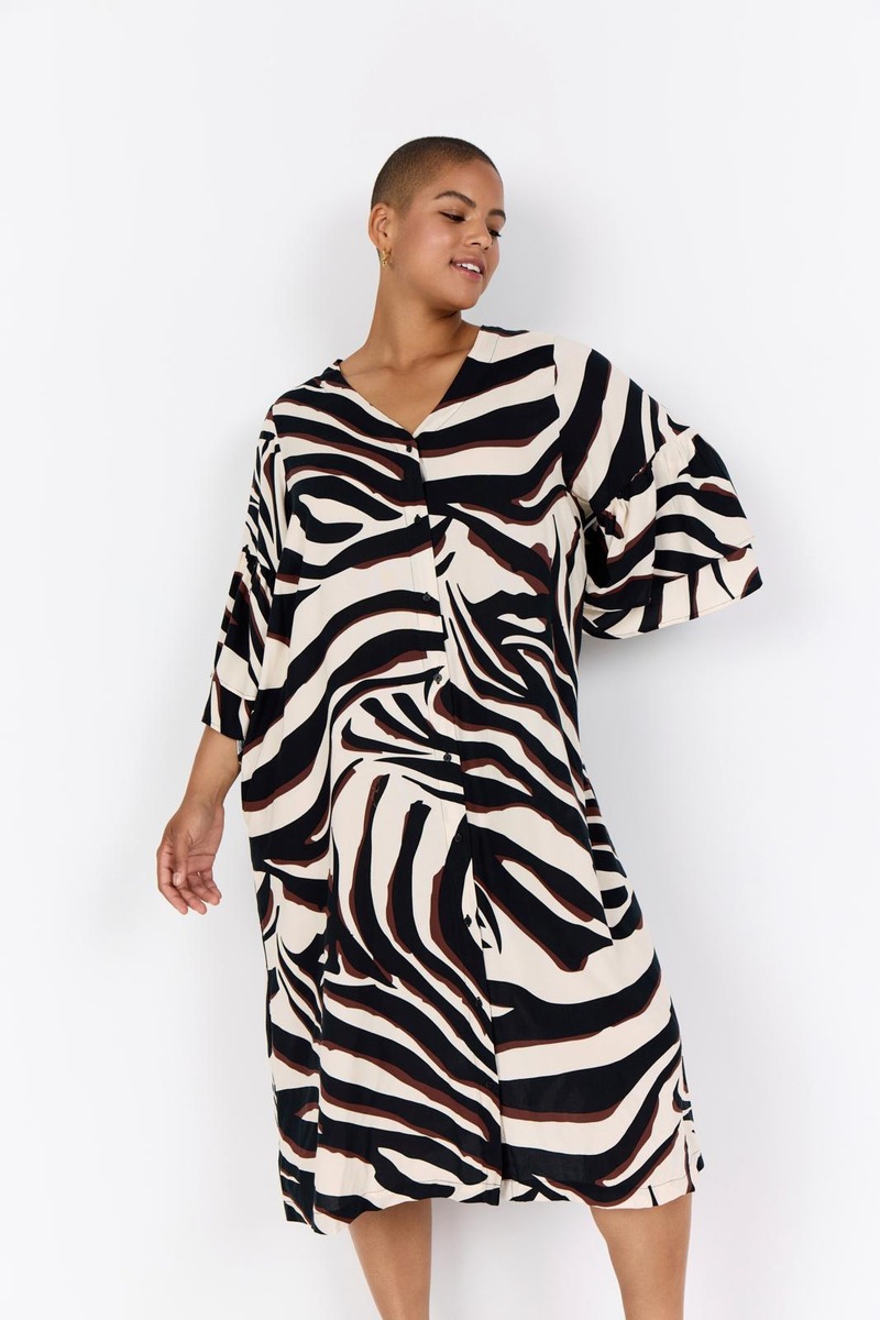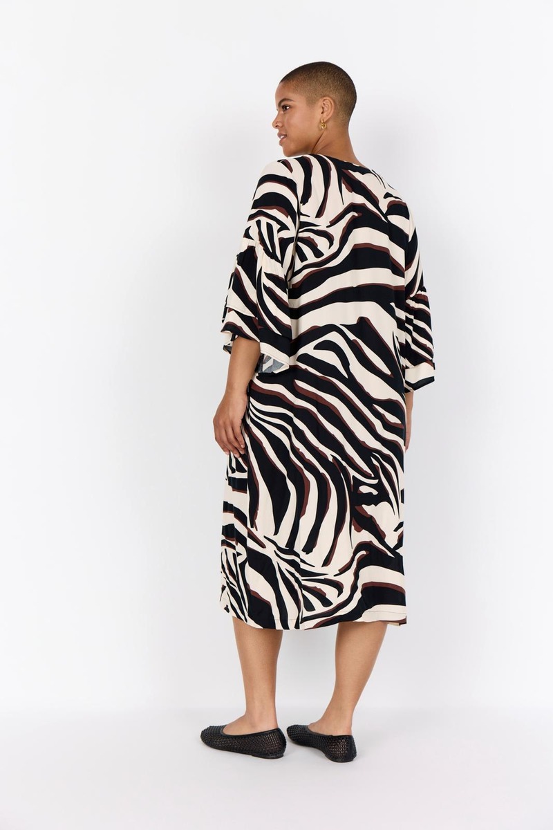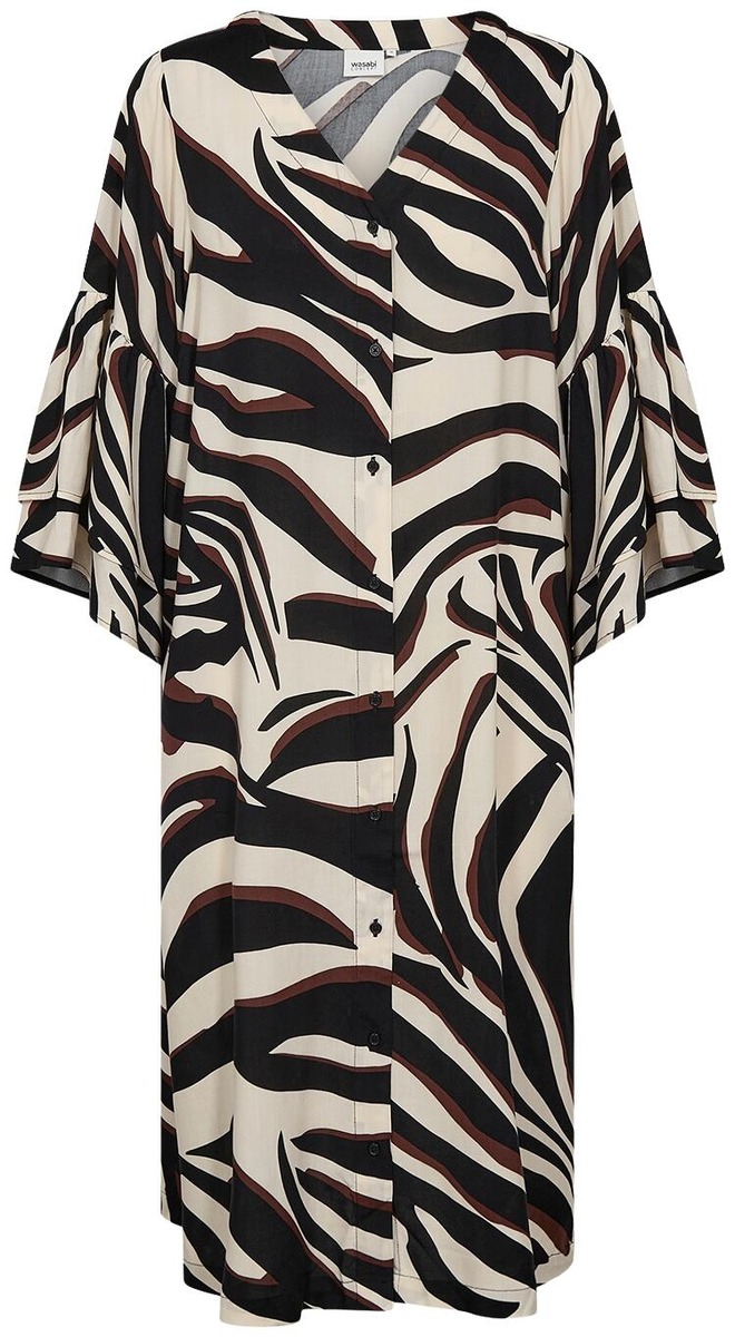 WA-SALMA 4 on kaunis mekko, joka on valmistettu 100 % LENZING™ ECOVERO™ -viskoosista. Mekossa on tyylikäs V-pääntie nappikiinnityksellä sekä näyttävä seeprakuosi. Yhdistä sandaaleihin rennon lookin luomiseksi tai nilkkureihin rohkean tyylin saavuttamiseksi.