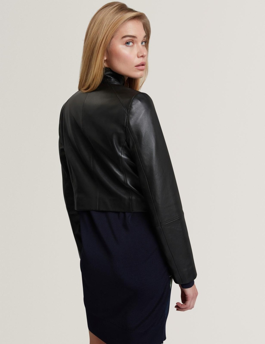 Lyhyt nahkajakku, jossa magneetti kiinnitys.