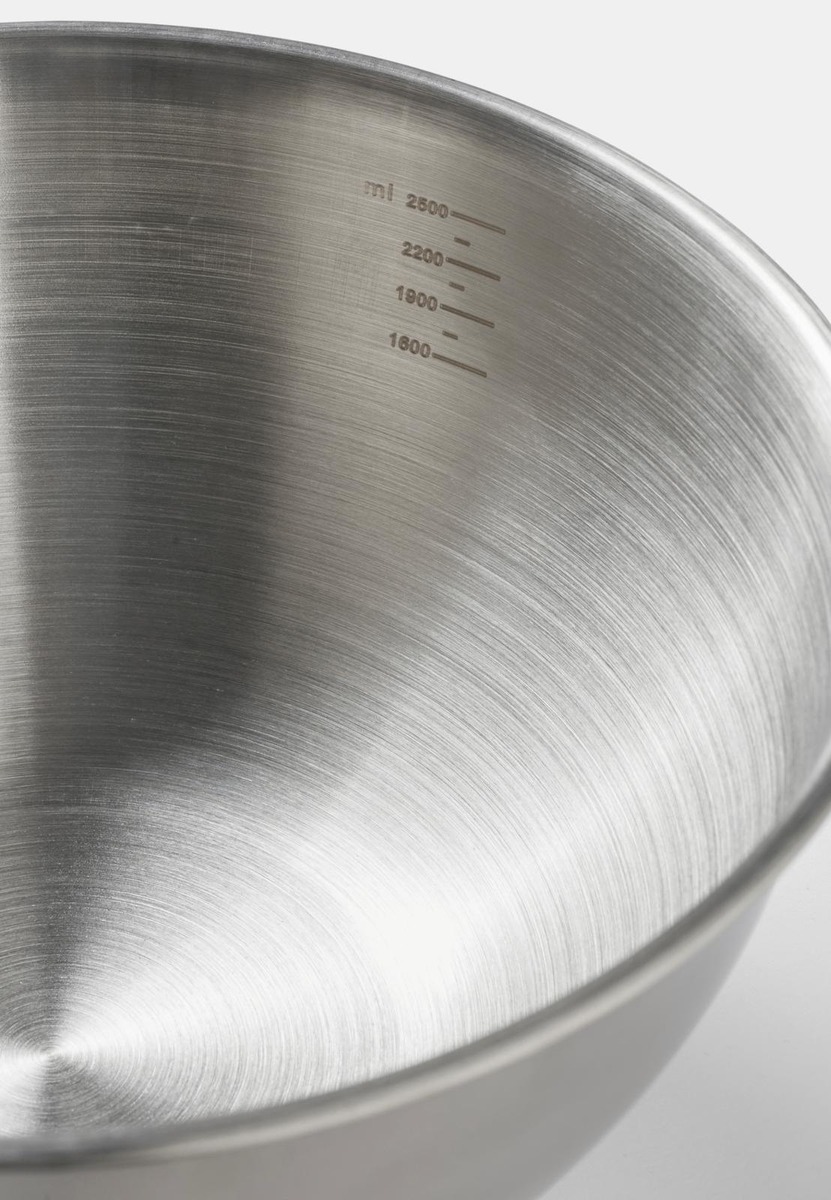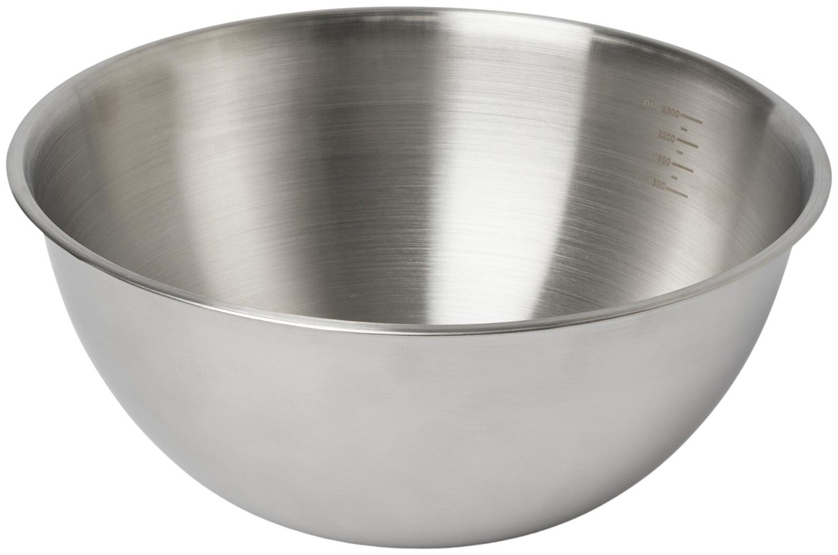 Ruostumattomasta teräksestä valmistettu kulho sopii täydellisesti kaikkiin jokapäiväisiin keittiötehtäviin. Kulhossa on mitta-asteikko sisällä ja reunat, joista on helppo pitää kiinni. Kulho on pinottava ja saatavilla useissa eri kokoisina. Konepesun kestävä. Tilavuus: 2,5. Mitat: Korkeus: 10,5 cm, Halkaisija: 25 cm