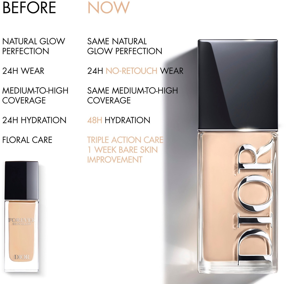 Dior Forever Skin Glow on 24 tunnin¹ heleyttä tarjoava meikkivoide, joka yhdistää huippuviimeistellyn meikin ja kolmitehoisen ihonhoidon. Ultrakevyt koostumus sulautuu ihoon tasoittaen ihonsävyä ja paljastaen luonnolisen hehkun – myös kameravalojen edessä.