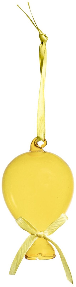 Keltaista Ilmapallo-lasikoristetta koristaa suloinen rusetti. Leikkisä lasikoriste on hymyilyttävä yksityiskohta pajunoksalla roikkuessaan ja sopii myös osaksi pääsiäisen kattauksia. Ilmapallo-lasikoristeen koko on 6x8 cm ja siinä on ripustunauha.