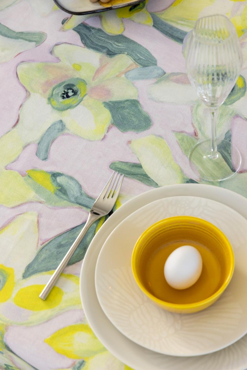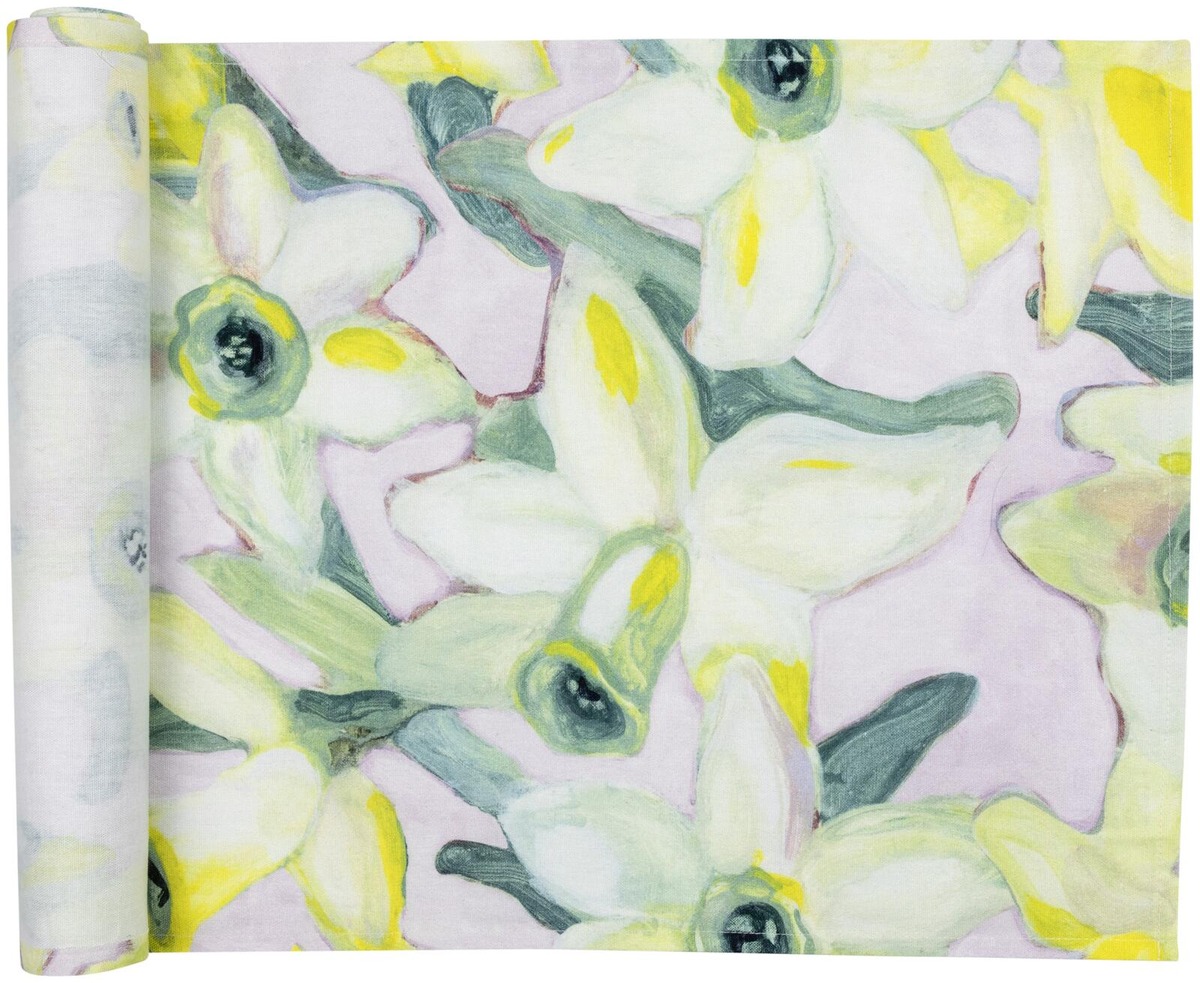 Iloisenväriset narsissit kiirehtivät nauttimaan kevätauringosta ensimmäisten kasvien joukossa, ja niistä on tullut hyvän ruuan ohessa tärkeä osa pääsiäisen viettoa monessa kodissa. Lasse Kovanen maalasi Narsissi-kuosin perinteisellä tempera-tekniikalla, jossa värien sidosaineena käytetään kananmunaa. Ikonimaalauksesta tutulle maalaustavalle on ominaista hento läpikuultavuus, joten kuosissa näkyvät kauniina yksityiskohtina siveltimenvedot ja useat maalauskerrokset. Narsissi-tekstiilit tuovat kotiin raikasta ja iloista pääsiäistunnelmaa trendikkäillä sitruunankeltaisilla sekä turkooseilla sävyillä. Pääsiäiskattauksiin sopiva Narsissi-kaitaliina on mitoiltaan 43x160 cm ja se on 100 % puuvillaa.