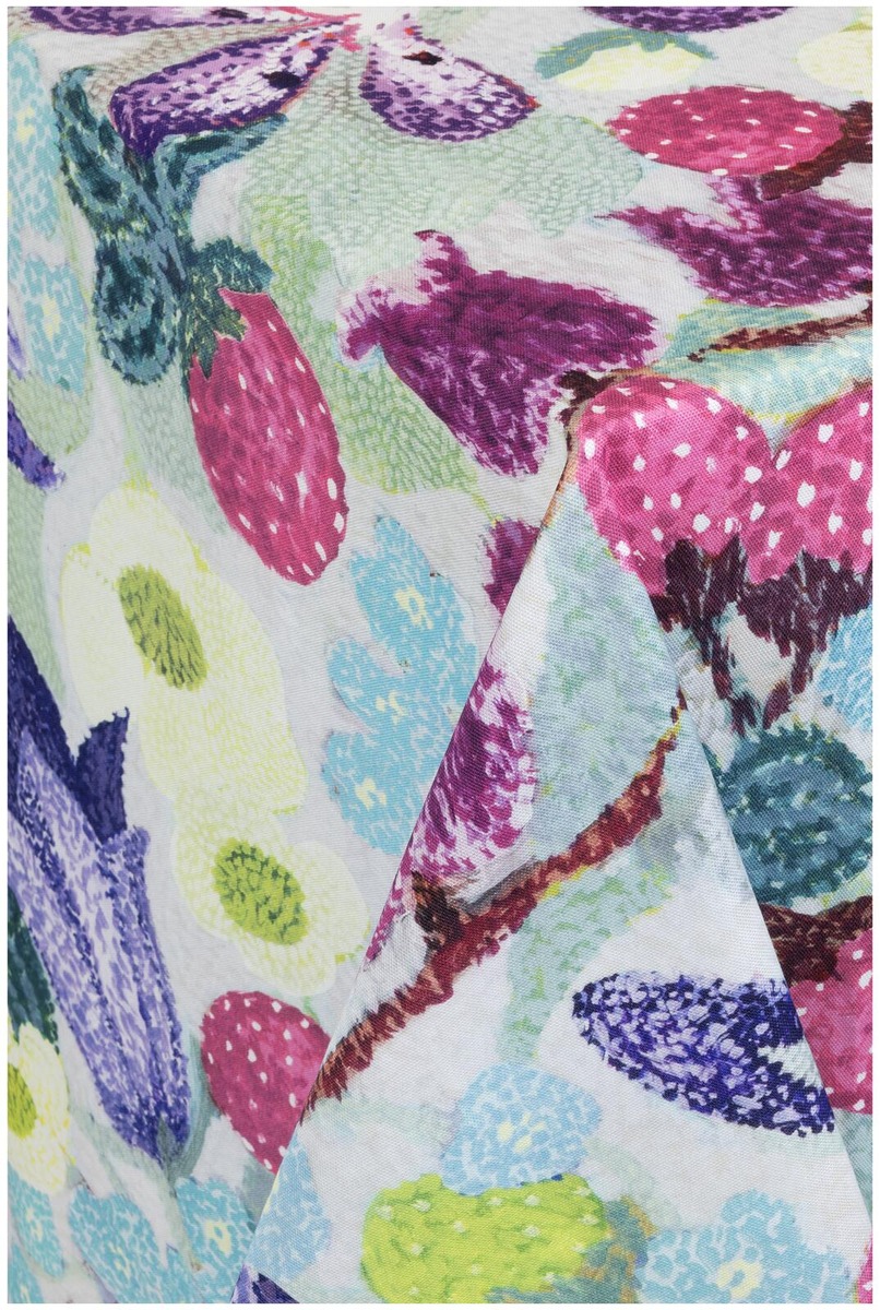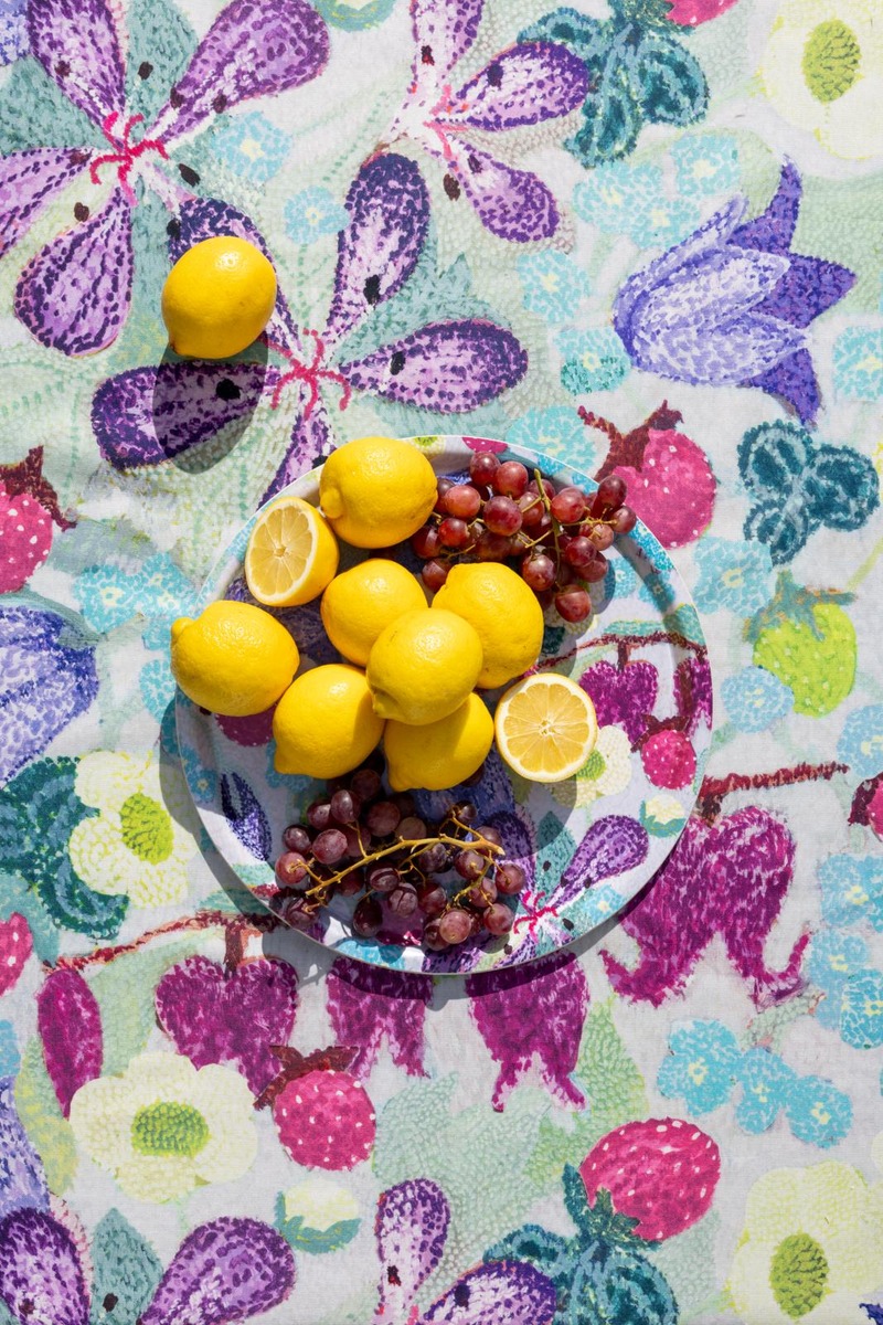 Pohjoisen kesän valo, lämpö ja kaikkialla hehkuvat värit houkuttelevat ulos keräämään muistoja, elämään täysillä ja hetkessä. Lasse Kovasen suunnittelema Kesä-kuosi kuplii ja pirskahtelee. Se on täynnä lapsenomaista iloa ja huolettomuutta. Metsämansikoita, Niittyleinikkejä, Kissankelloja ja Kurjenpolvia villisti sikinsokin aseteltuina. Kuosi on maalattu tempera-tekniikalla pointillistiselle maalaustavalle ominaiseen pistemäiseen tyyliin. Leikkisä ja runsas kesäinen kuosi on saatavilla kattaus- ja keittiötekstiilien, tyynynpäällisen ja kankaiden muodossa. Kesä-malliston värikäs pöytäliina on mitoiltaan 145x250 cm ja se on 100 % puuvillaa.