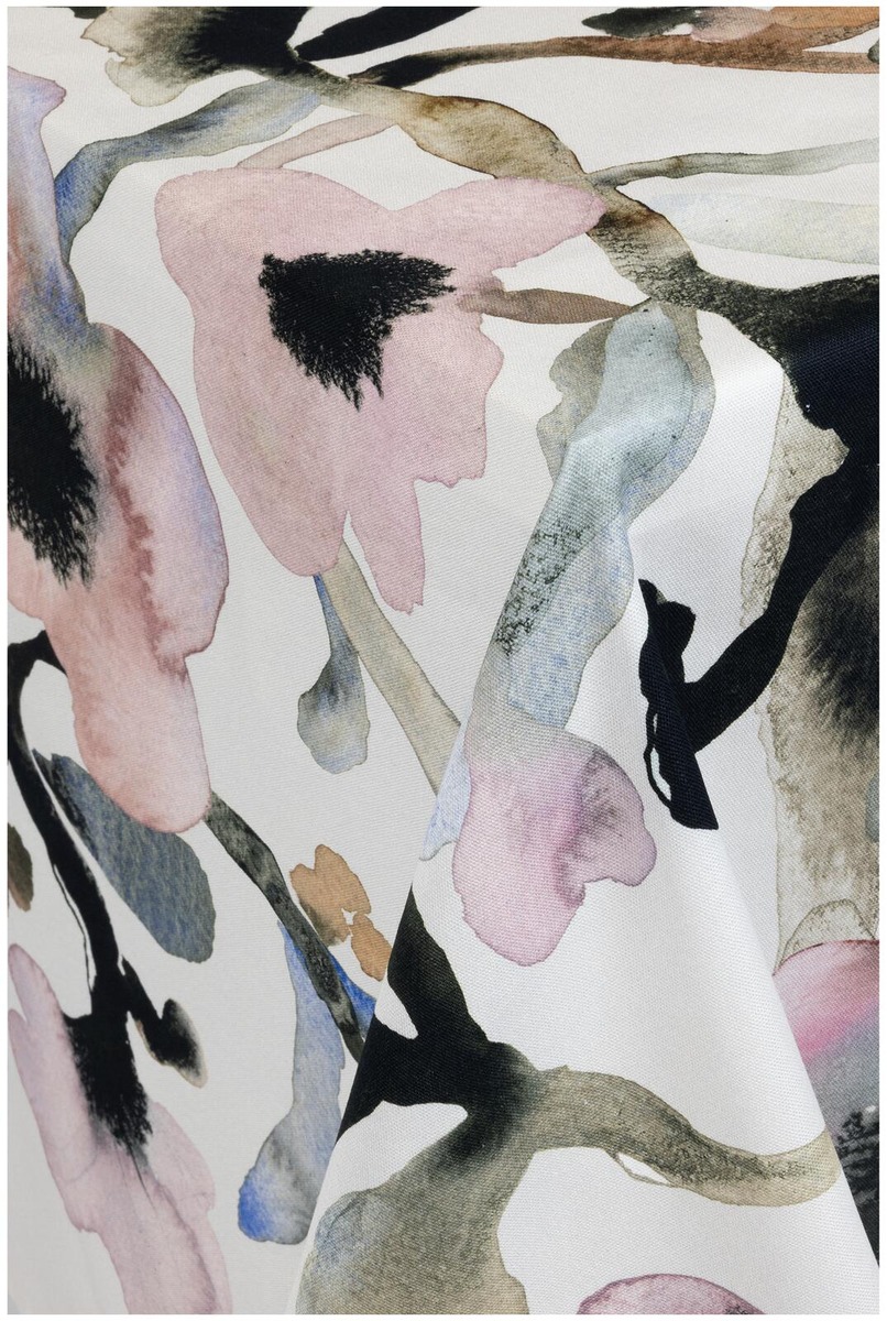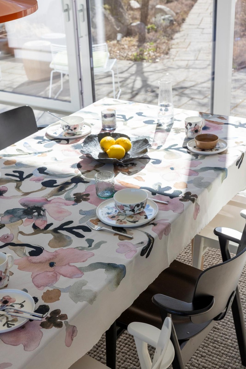 Ruusumalva-kuosin kukat levittäytyvät keskeltä reunoja kohti kuin puu, joka ojentelee oksiaan pitkien talviunien jälkeen. Kotiin Ruusumalva-kuosi levittäytyy muun muassa astioiden, kankaiden, vuodevaatteiden, kattaus- ja keittiötekstiilien, sekä tyynynpäällisten muodossa. Ruusumalva-pöytäliinan koko on 145x250 cm ja se on 100% puuvillaa.