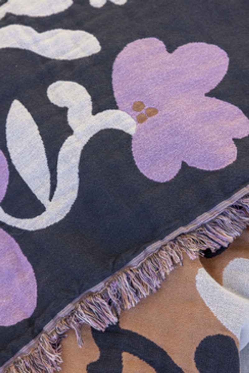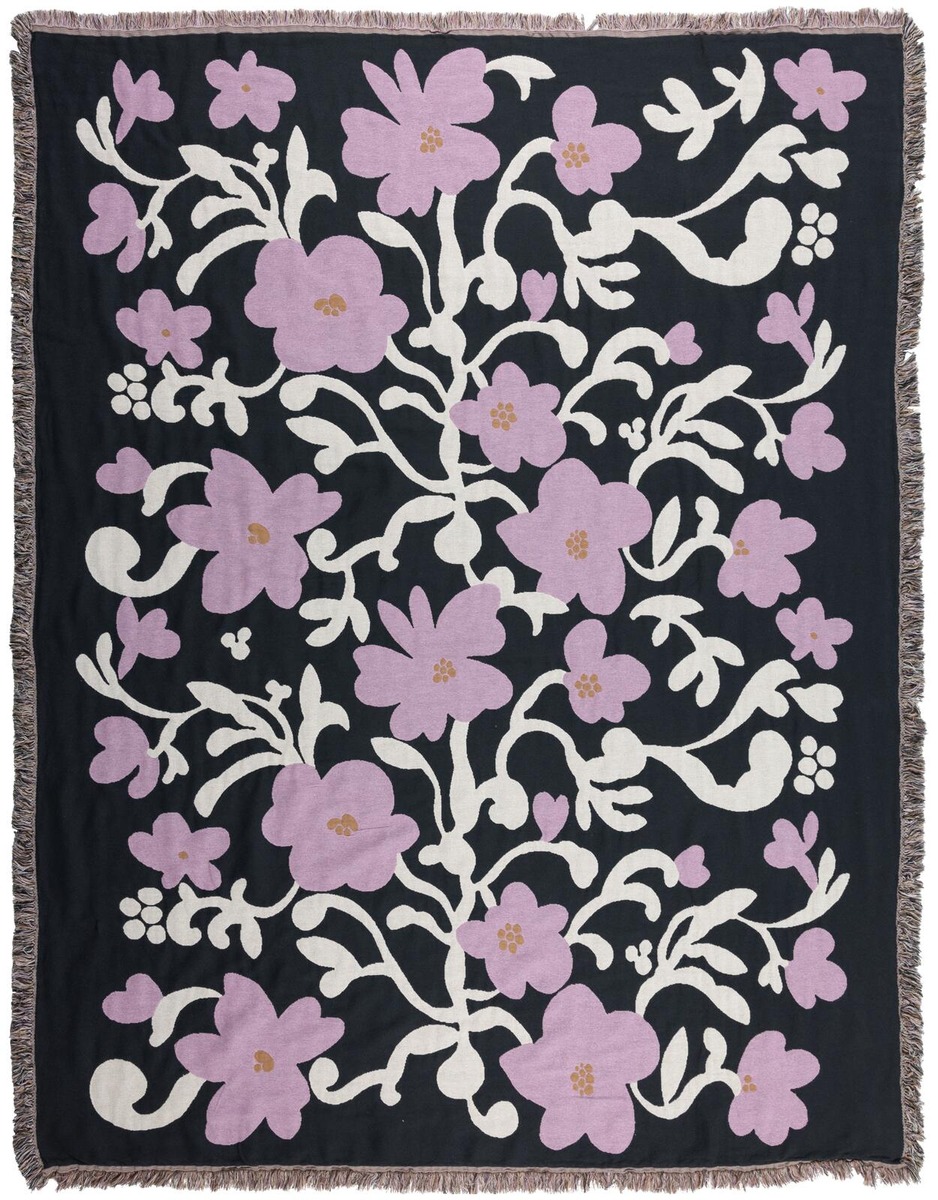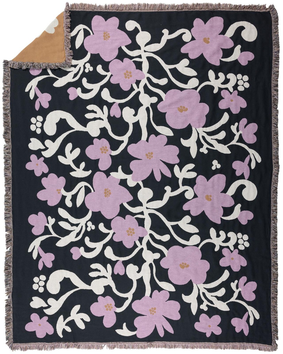 Ruusumalva-kuosin kukat levittäytyvät keskeltä reunoja kohti kuin puu, joka ojentelee oksiaan pitkien talviunien jälkeen. Kotiin Ruusumalva-kuosi levittäytyy muun muassa astioiden, kankaiden, vuodevaatteiden, kattaus- ja keittiötekstiilien, sekä tyynynpäällisten muodossa. Ruusumalva-malliston tummanharmaa torkkupeitto on kooltaan 130x170 cm ja sen materiaali on 100% puuvillaa.