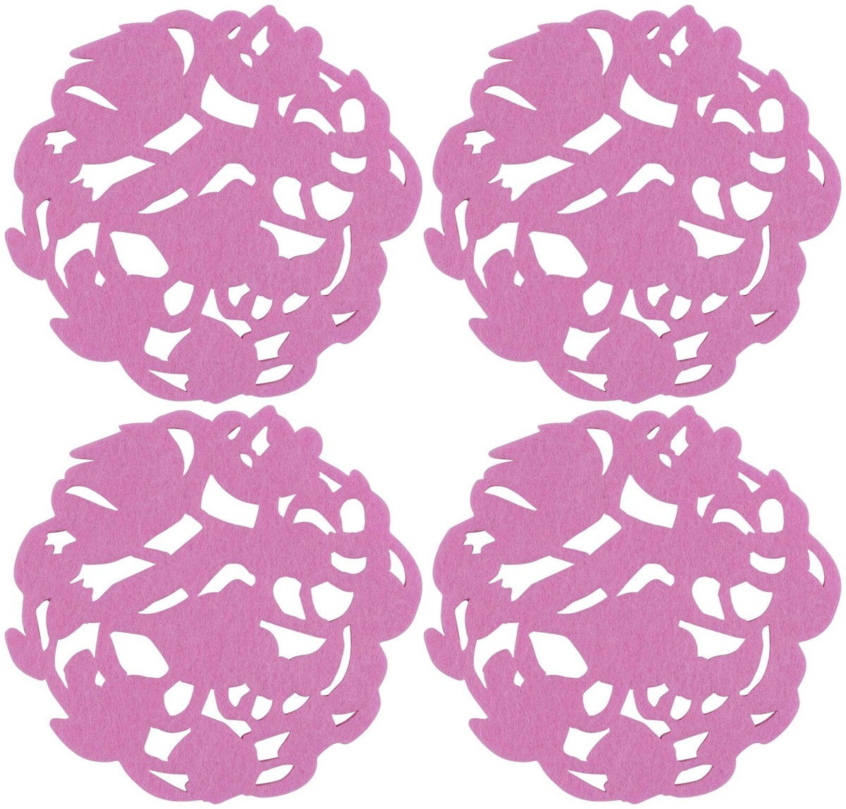 Lasse Kovasen maalaamien kukkien silueteista muotonsa saaneet Kukkanen-lasinaluset suojaavat pöytää kuumilta astioilta ja tuovat kattauksiin viimeistellyn ilmeen. Vaaleanpunaisten Kukkanen-lasinalusten materiaali on kaunista ja kestävää, huopaa muistuttavaa polyesteriä ja ne ovat halkaisijaltaan 11 cm. Myydään 4 kappaleen setteinä.