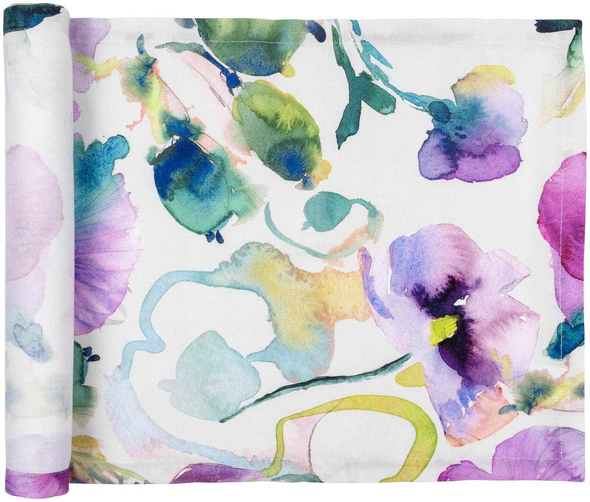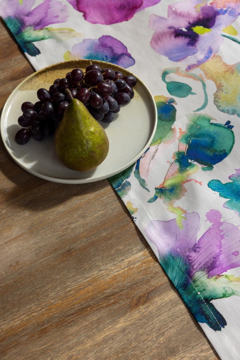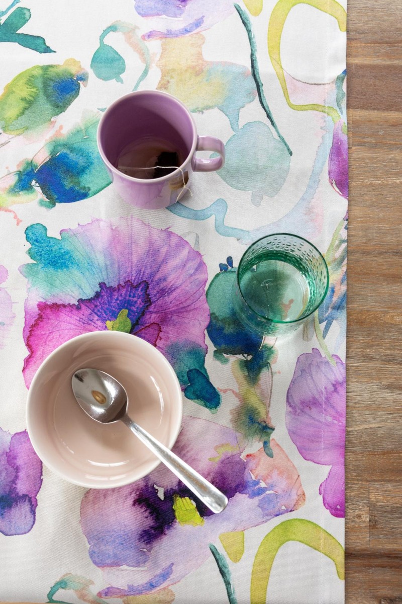 Rönsyilevän iloinen Kukkapelto-kuosi on syntynyt akvarelliväreillä. Kukkapelto-malliston värikäs, pitkä kaitaliina on kooltaan 45x220 cm. Kaitaliina on akryylipinnoitettua puuvillakangasta, joka on käytännöllinen valinta ruokapöytään, sillä se hylkii likaa ja on helppo pyyhkiä puhtaaksi.