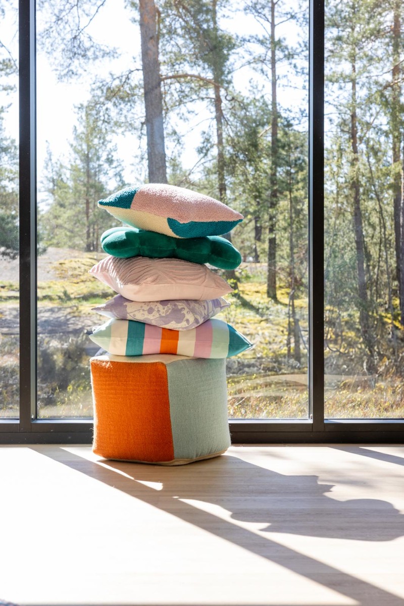 Värien rohkaisemana koti sisustetaan nyt juuri siten, kuin itsestä hyvältä tuntuu. Pentik Tuntu-astioista lainatut värit loistavat nyt myös tekstiileissä, joita löytyy aina torkkupeitoista kattaus- ja keittiötekstiileihin. Tuntu-rahi tuo jo yksistään iloa, leikkisyyttä ja väriä olohuoneeseen, mutta parhaimmillaan se on saman sarjan tyynynpäällisten seurassa. Turkoosi-oranssin Tuntu-rahin koko on 45x45x45 cm. Sen päällyskangas on 100% puuvillaa ja täyte polyesteriä.