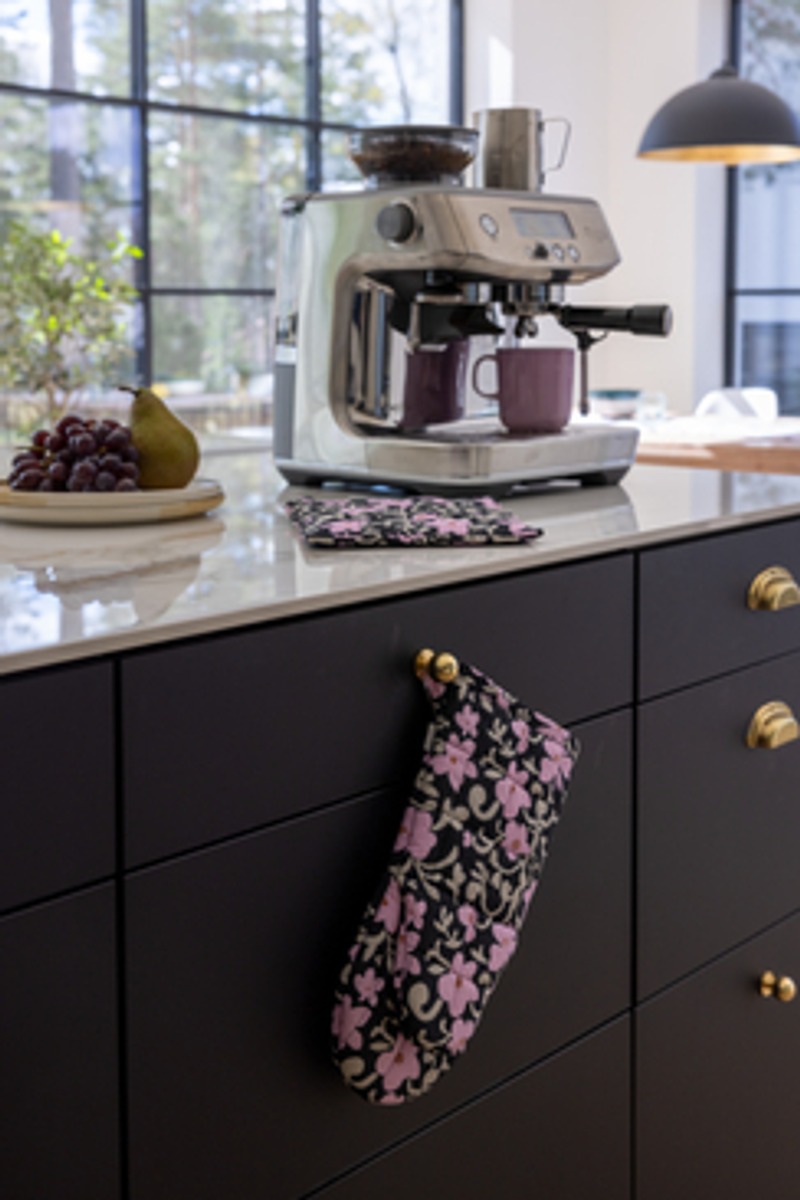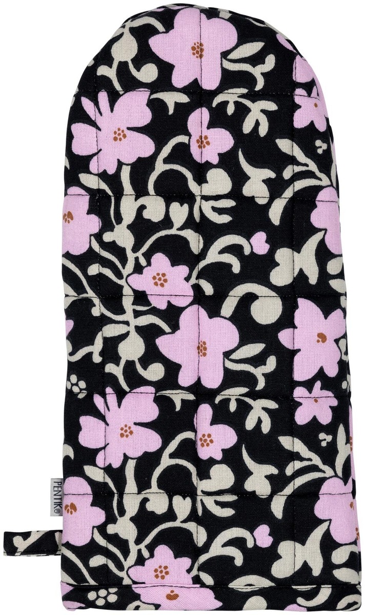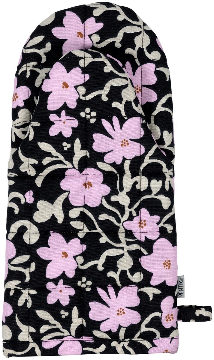 Ruusumalva-malliston vaaleanpuna-musta patakinnas on kooltaan 16x31 cm. Patakintaan voi pestä koneessa 60 asteessa. Varo uunin vastuksia ja avotulta. Tuote on tarkoitettu kuumien astioiden käsittelyyn.