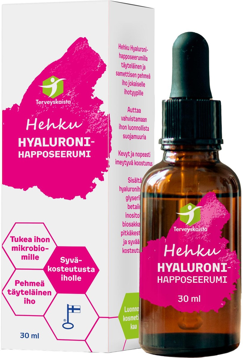 Tuo ihosi hehku esiin tehokkaalla Hehku Hyaluronihapposeerumilla, joka kosteuttaa ihoa syvältä ja tekee siitä sileämmän, kimmoisamman ja elinvoimaisemman. Tämä kotimainen hyaluronihapposeerumi sisältää Sodium hyaluronatea – hyaluronihapon pienimolekyylistä ja tehokkaampaa muotoa, joka imeytyy tavallista syvemmälle ihoon.