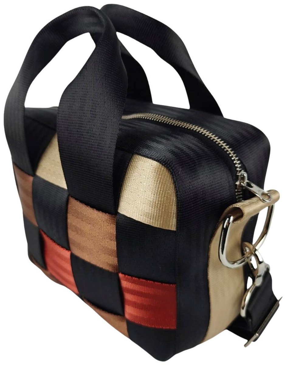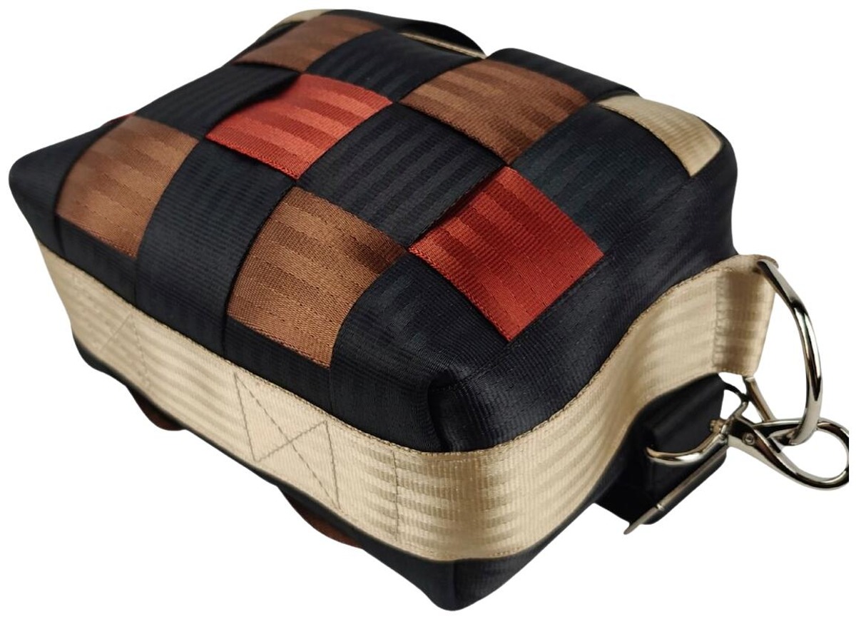 Materiaali: Kakkoslaatuiset turvavyöt, vuori ylijäämäkankaat. Uusia osia ovat metalliosat.